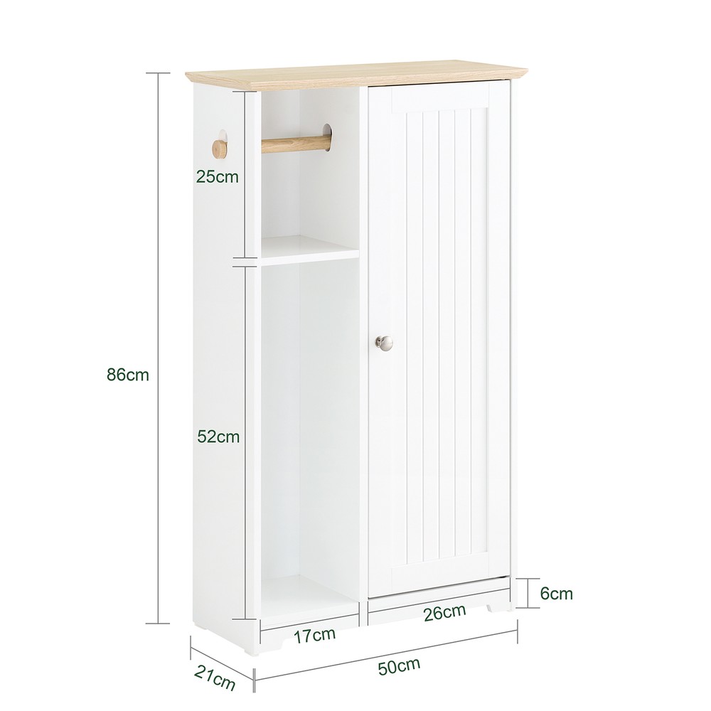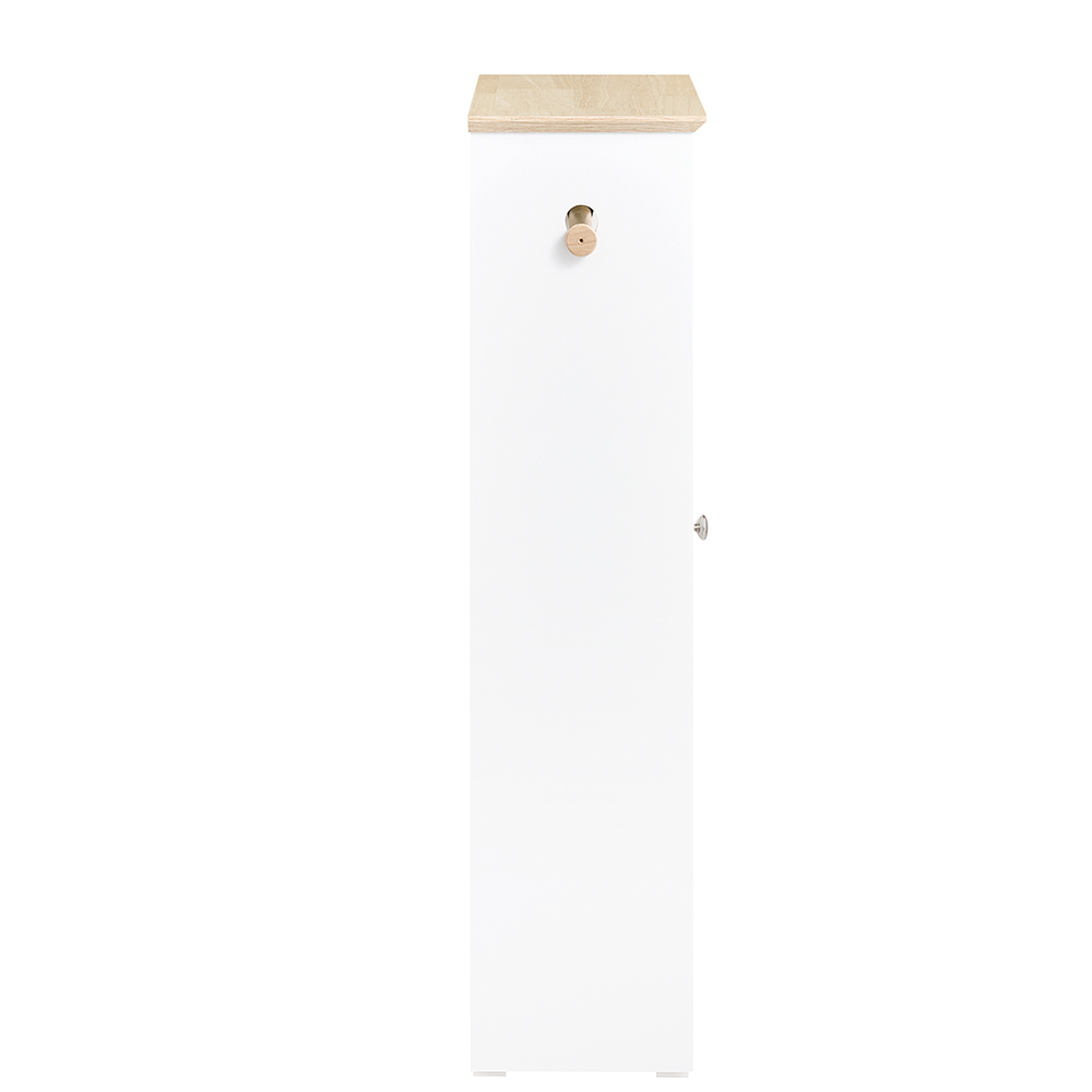 86 cm korkea, 50 cm leveä ja vain 21 cm syvä kaappi tarjoaa runsaan säilytystilan pienessä tilassa. Sisällä on integroitu wc-paperiteline sekä lisätila wc-paperin varalle. Kauniisti suunnitellun lamelliove