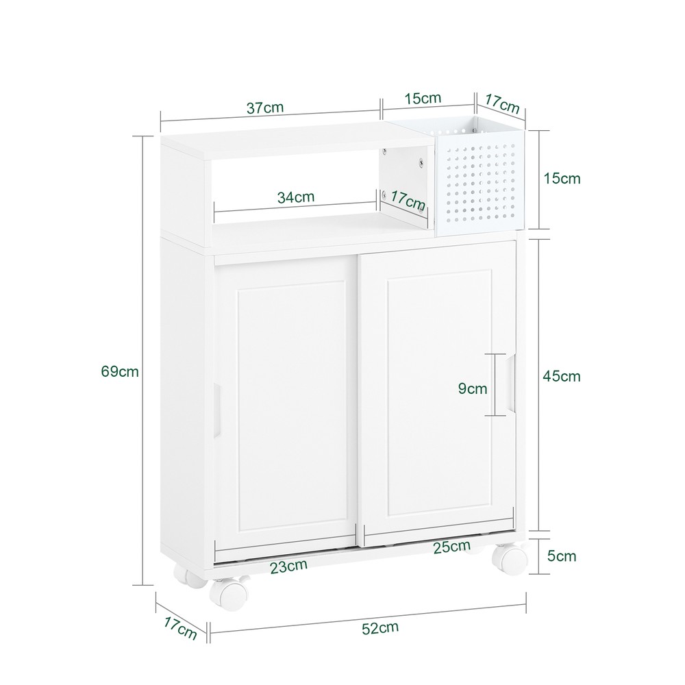 Neljä 360-asteista pyörää tekevät kaapista helposti siirrettävän, ja sisäänrakennetut jarrut varmistavat vakaan asennon tarvittaessa. Ympäristöystävällinen E1-luokiteltu MDF-materiaali takaa turvallisen ja kestävän käytön.