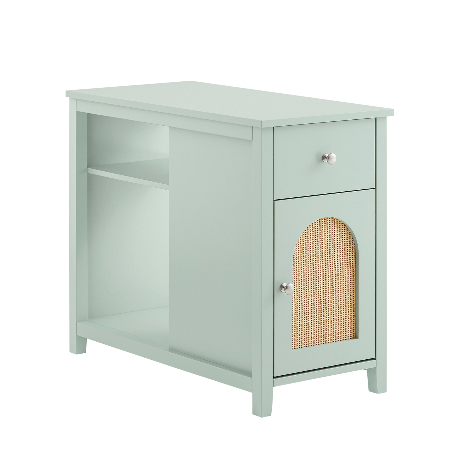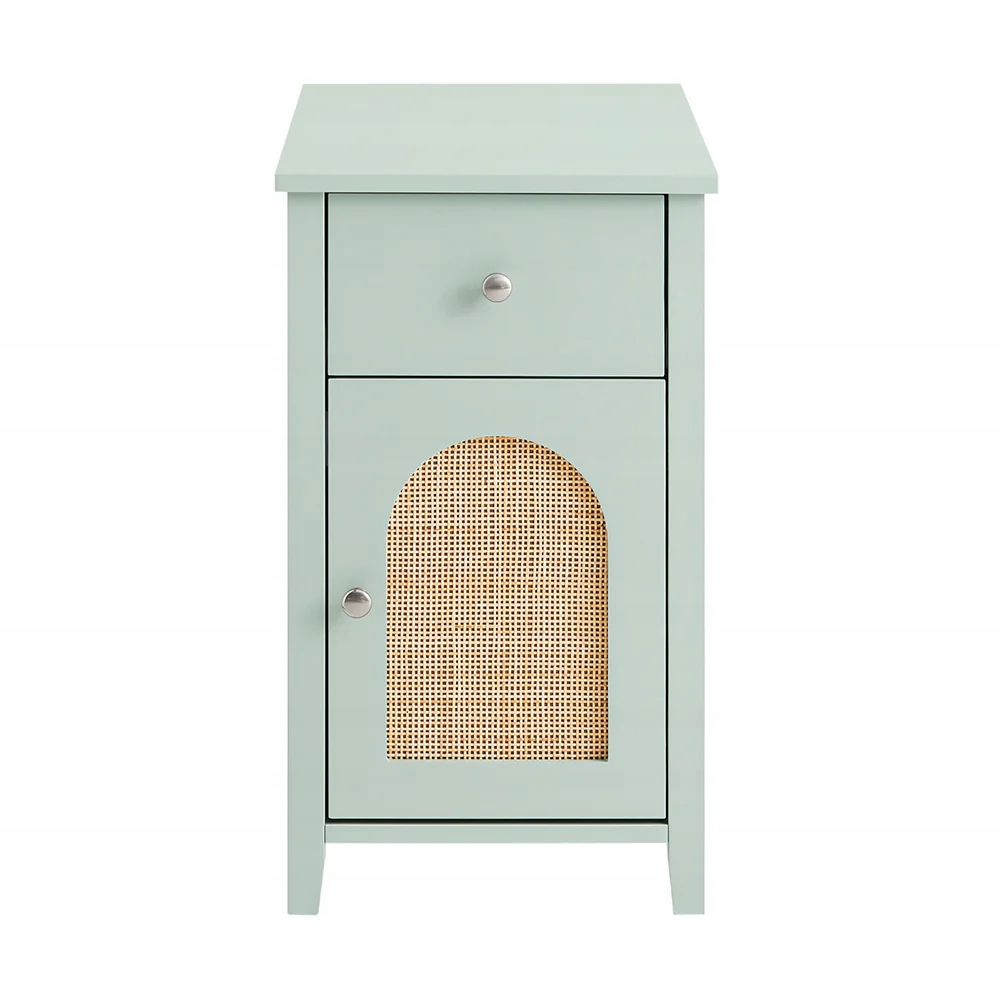 Yöpöydän siisti neliömäinen muoto ja raikkaat värit sopivat harmonisesti moderniin sisustukseen. Rottinkiset ovet ja minimalistinen linjaus tuovat luontoa sisätiloihin tyylikkäästi.