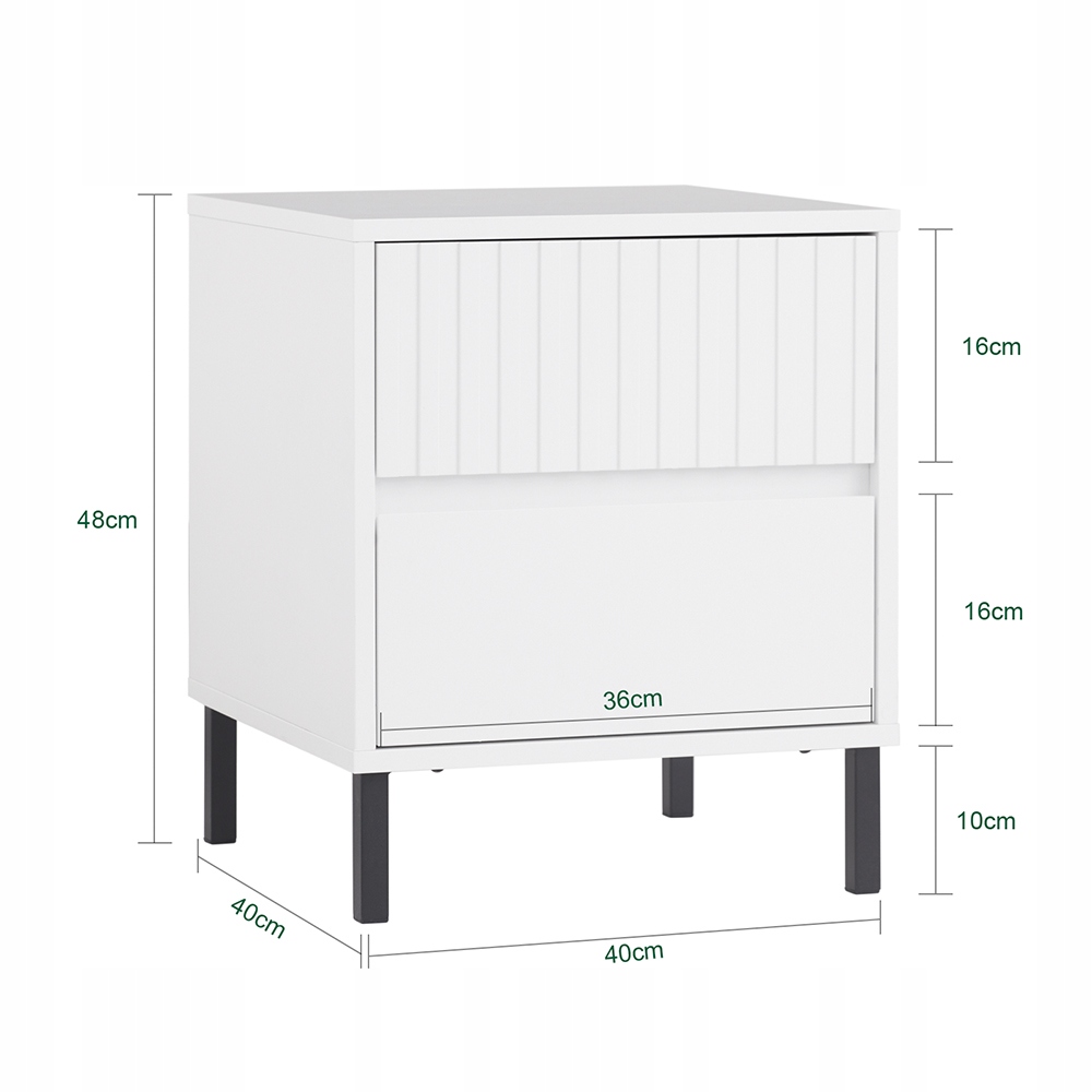 Tämä SoBuyn moderni yöpöytä yhdistää tyylikkään pohjoismaisen muotoilun ja käytännöllisyyden. Valkeat pystysuorat raidat ja minimalistinen estetiikka sopivat täydellisesti suomalaiseen sisustukseen. Yöpöydän yläpaneeli tarjoaa tilaa kirjoille ja koriste-esineille, kun taas kahdessa laatikossa voit säilyttää pienet tavarat siististi järjestyksessä.