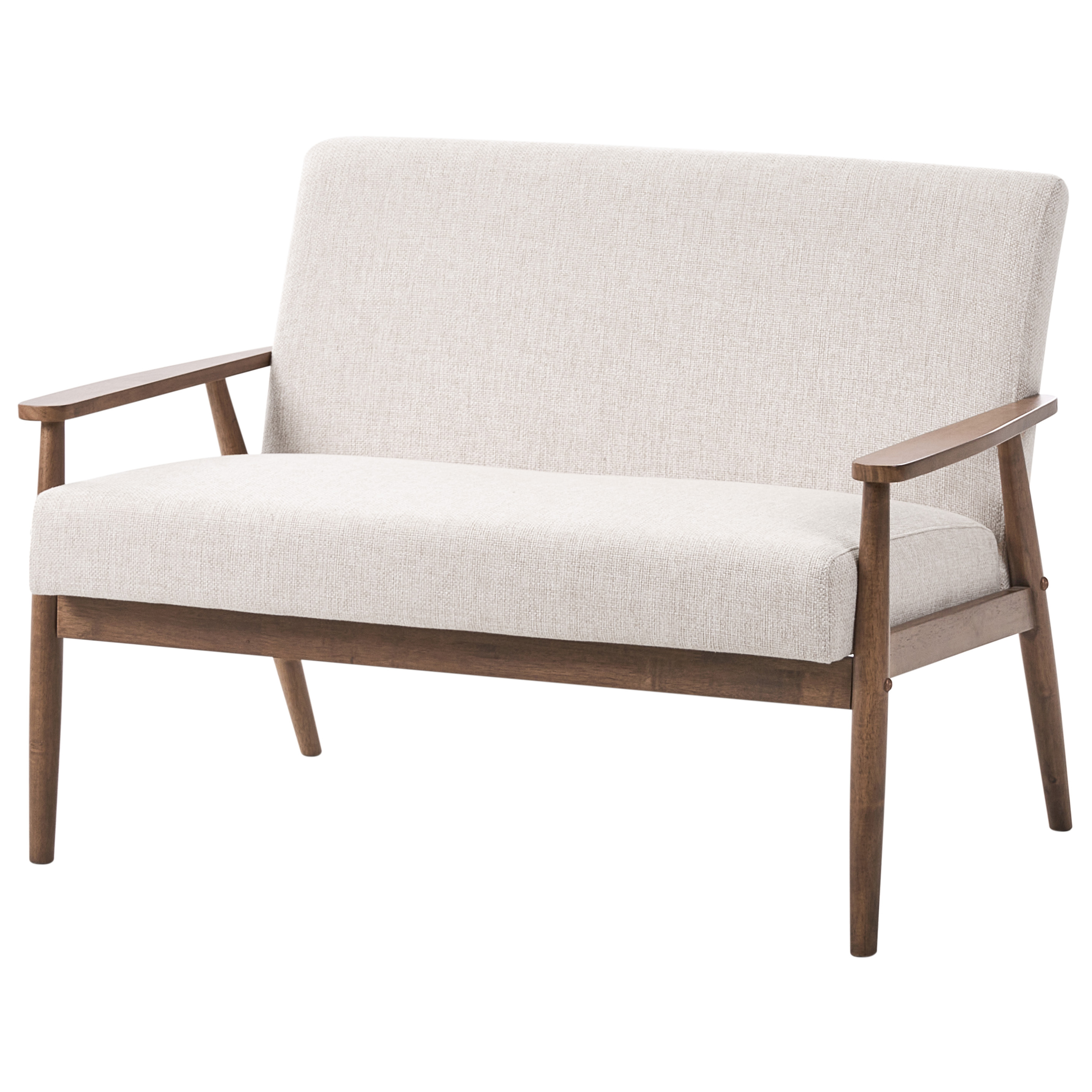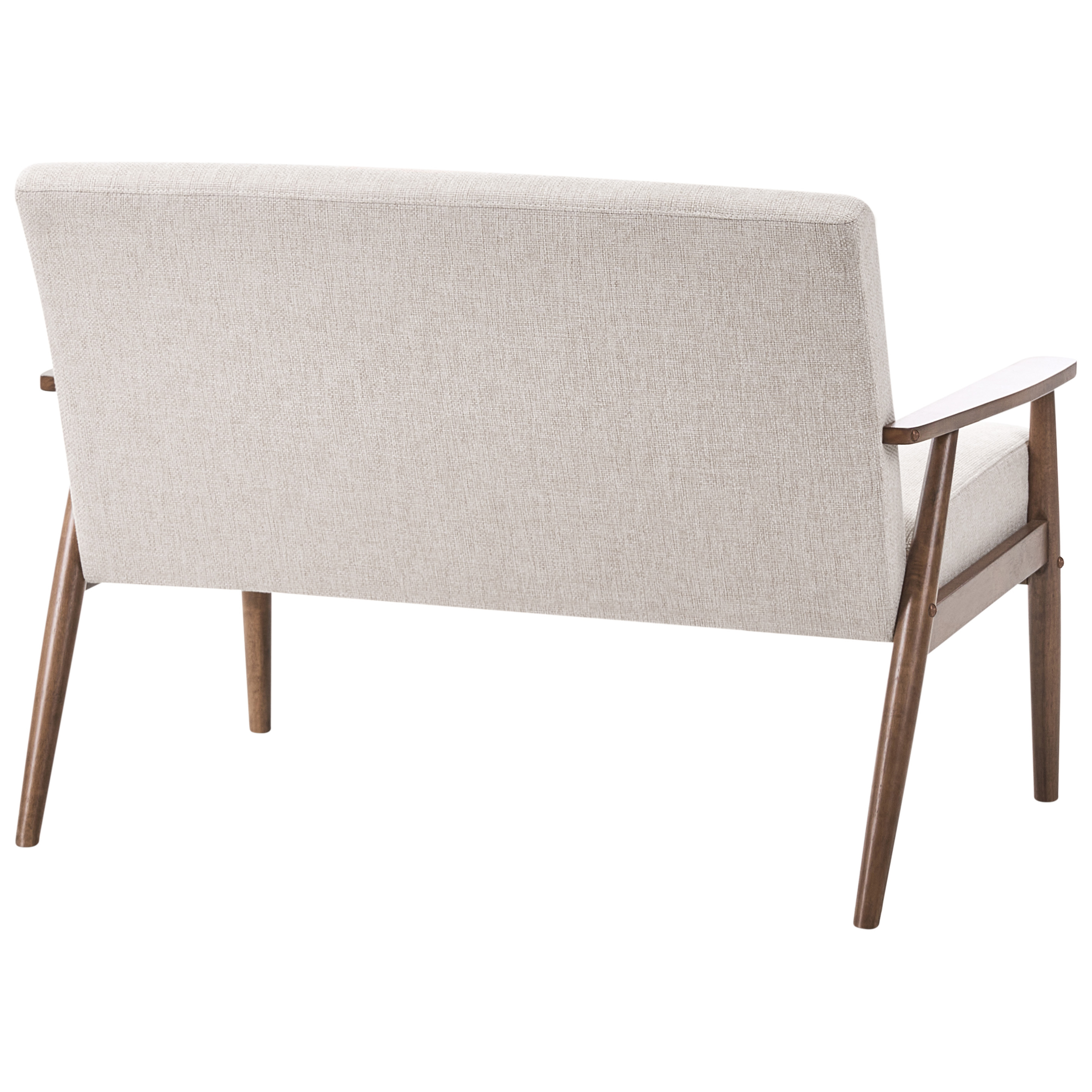 Retrotyylinen sohva puisilla käsinojilla. Päivitä asuintilaa tällä tyylikkäällä ja mukavalla 2-istuttavalla sohvalla. Se on verhoiltu pehmeällä, teksturoidulla polyesterikankaalla ja tarjoaa viihtyisän paikan rentoutumiseen. Tukeva puurunko ja puiset käsinojat tuovat ripauksen luonnollista lämpöä ja korostavat vuosisadan puolivälin modernia charmia. Täydellinen olohuoneeseen tai lukunurkkaukseen, yhdistäen vaivattomasti hienostuneisuuden ja mukavuuden.