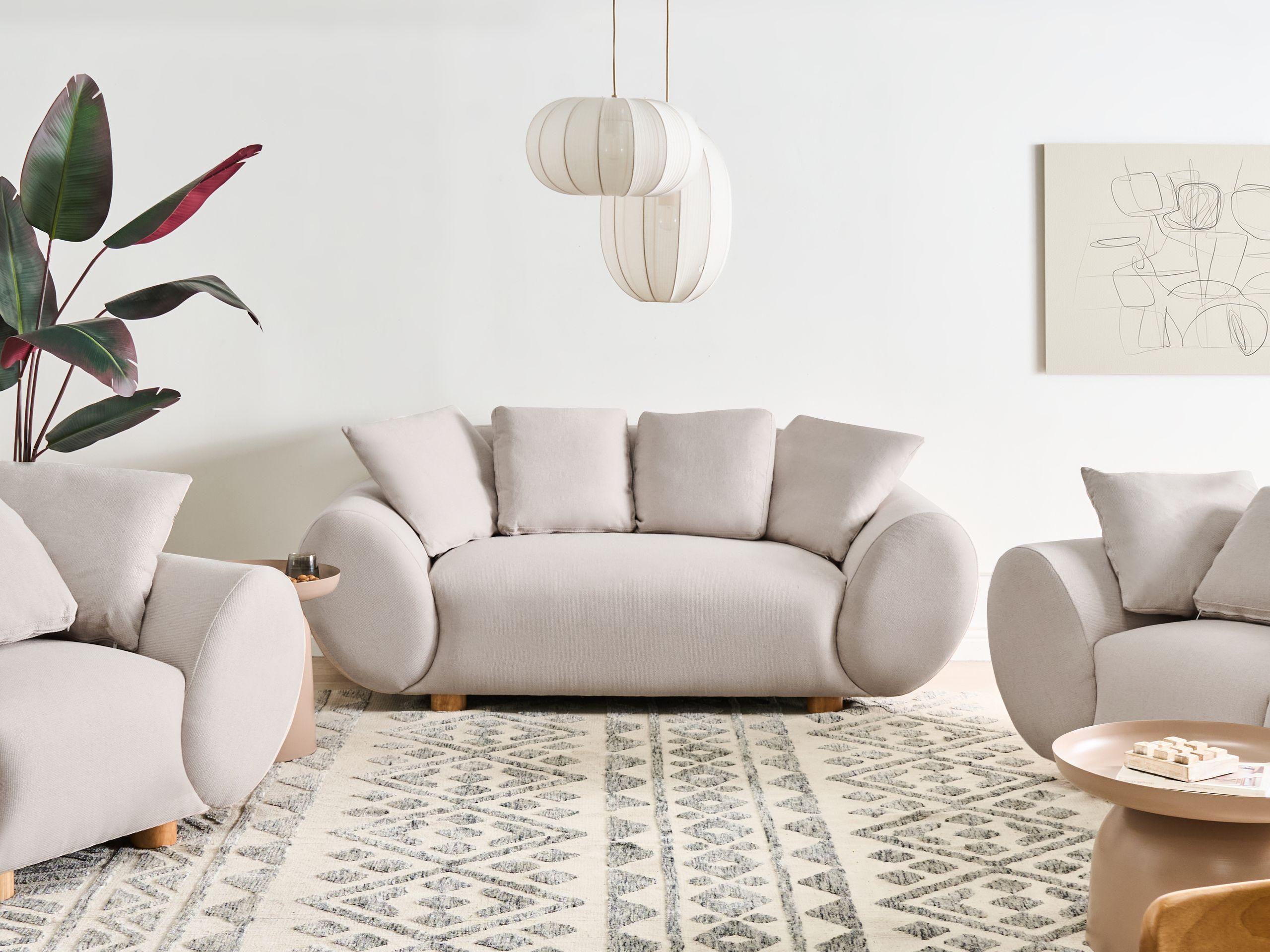 Paksusti pehmustettu sohva koristetyynyillä. Tämä kauniisti muotoiltu sohva yhdistää mukavuuden ja tyylin – se sopii täydellisesti moderneihin olohuoneisiin. Sohva on verhoiltu pehmeällä kankaalla, joka takaa mukavan istumakokemuksen, ja mukana tulevat muhkeat koristetyynyt kohottavat istumamukavuutta. Tyynyissä on irrotettavat päälliset, mikä tekee sohvan ilmeen päivittämisestä vaivatonta.