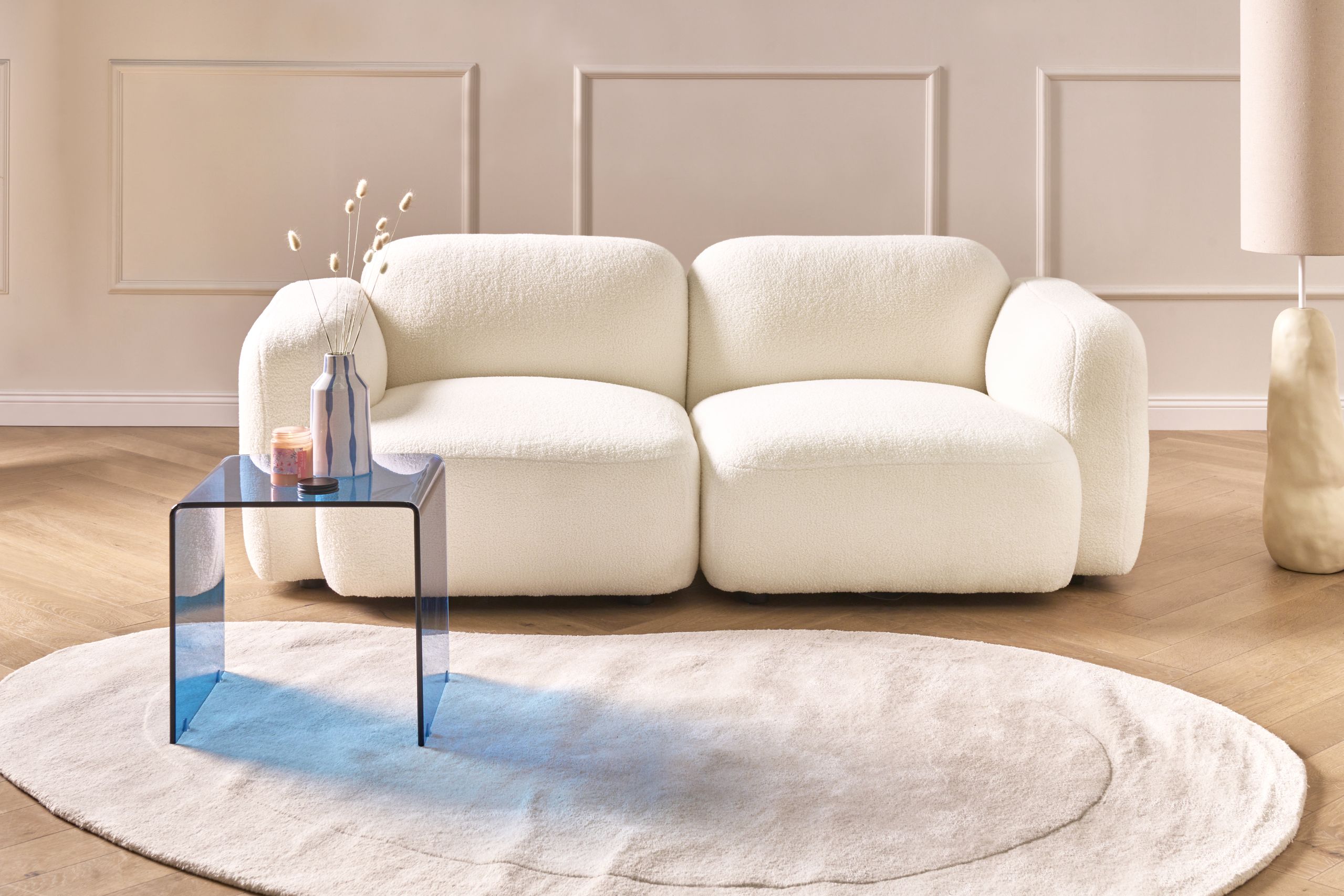 Skandinaavinen modulaarinen verhoiltu sohva. Tämä muhkea 3-istuttava moduulisohva yhdistää mukavuuden ja skandinaavisen muotoilun. Se on verhoiltu pehmeällä bukleekankaalla, joka näyttää kauniilta mistä kulmasta tahansa ja tekee sohvasta erinomaisen olohuoneen keskipisteen. Poppelipuusta valmistetut jalat on varustettu suojatapeilla, jotka suojaavat lattiaa naarmuilta. Mukana toimitettu liitin pitää moduuliosat tukevasti paikoillaan.