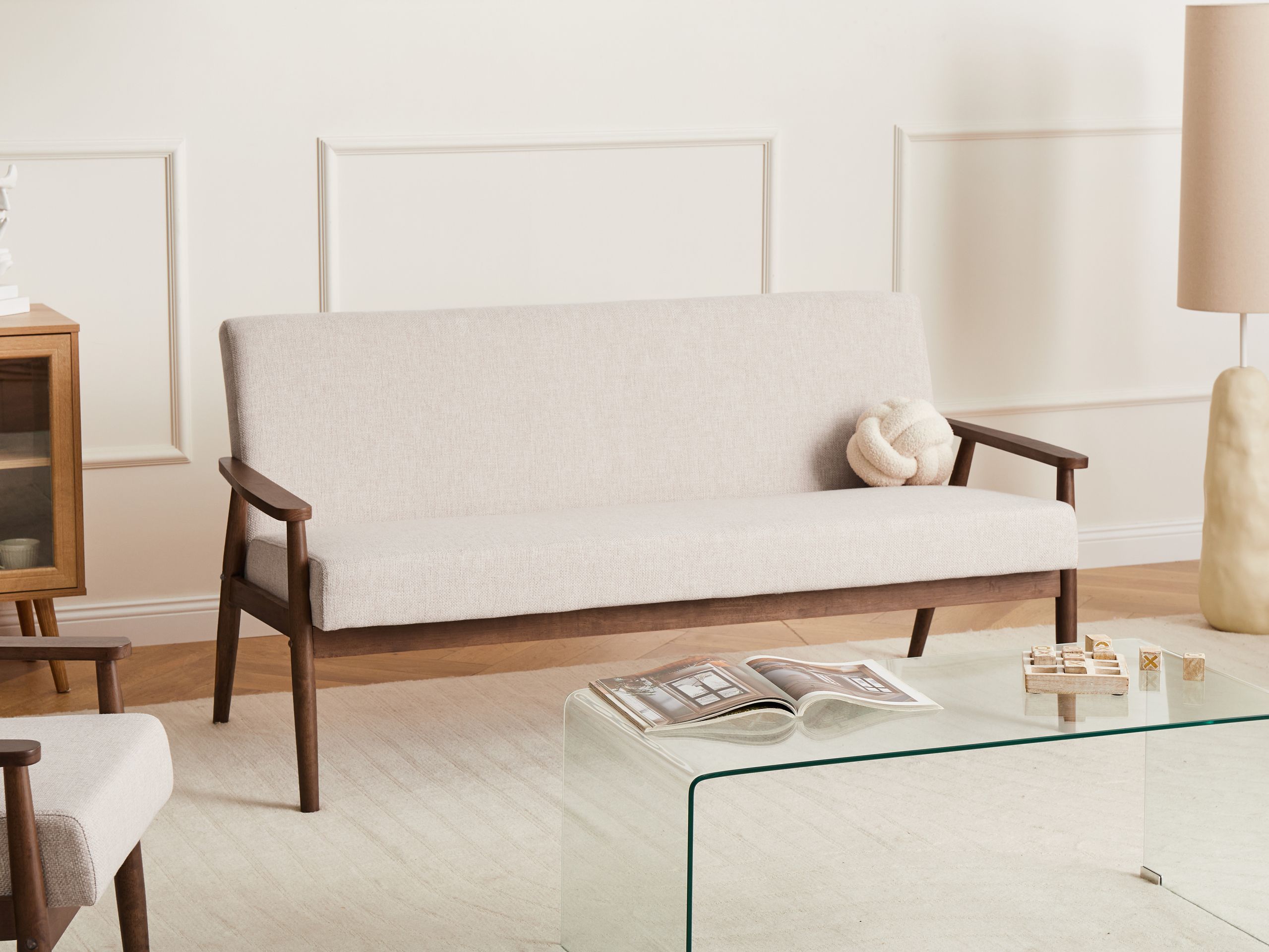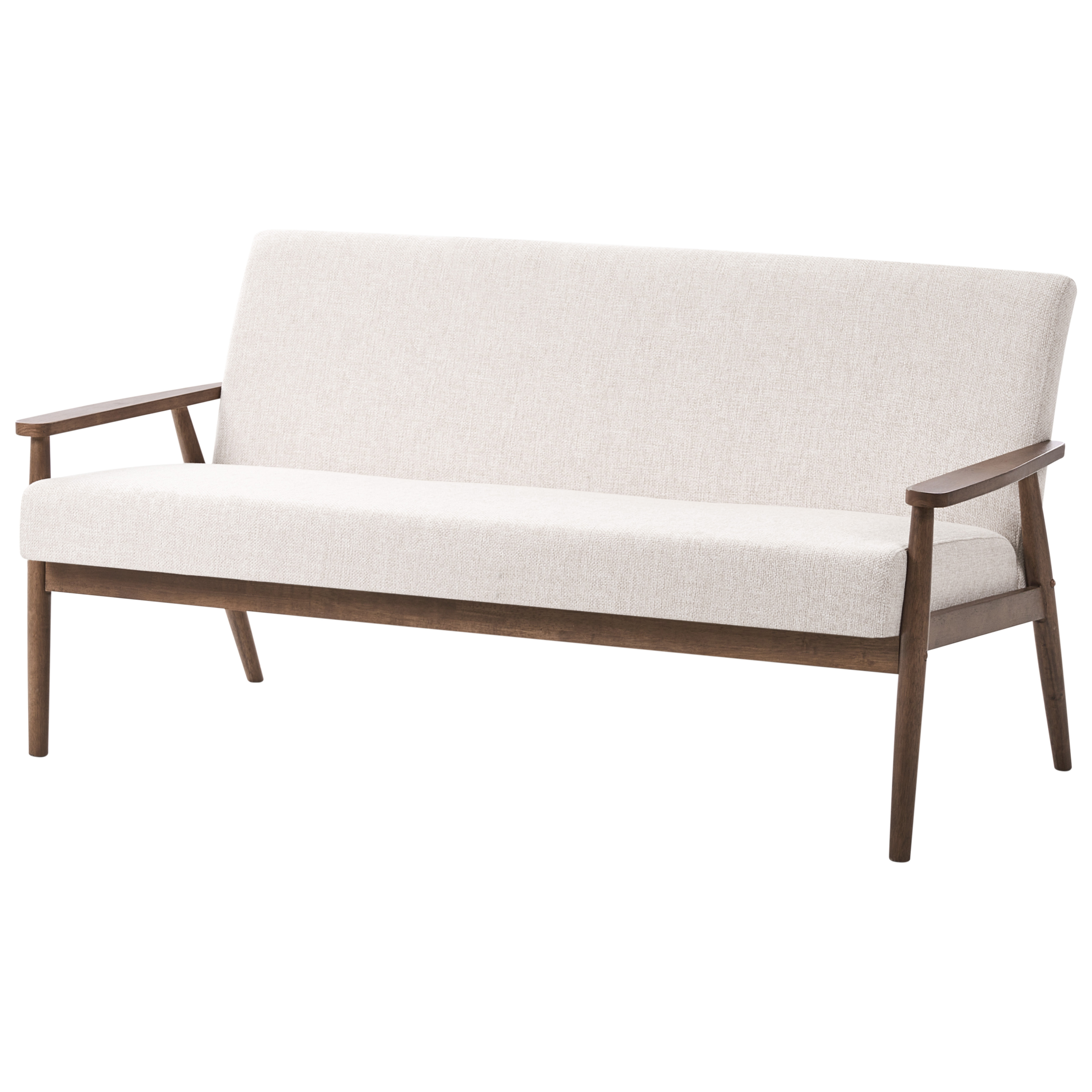 Retrotyylinen sohva puisilla käsinojilla. Päivitä asuintilaa tällä tyylikkäällä ja mukavalla 3-istuttavalla sohvalla. Se on verhoiltu pehmeällä, teksturoidulla polyesterikankaalla ja tarjoaa viihtyisän paikan rentoutumiseen. Tukeva puurunko ja puiset käsinojat tuovat ripauksen luonnollista lämpöä ja korostavat vuosisadan puolivälin modernia charmia. Täydellinen olohuoneeseen tai lukunurkkaukseen, yhdistäen vaivattomasti hienostuneisuuden ja mukavuuden.