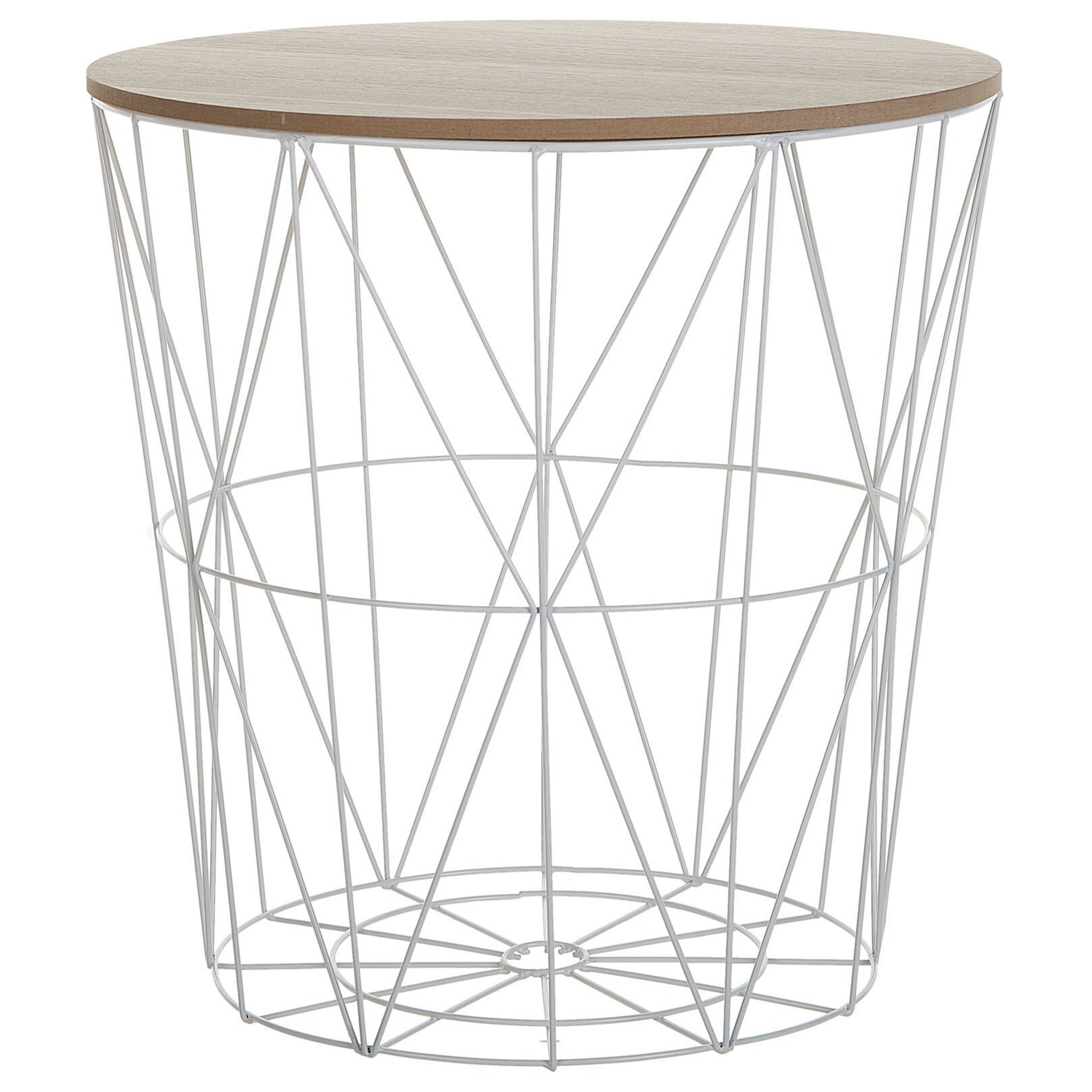 Pyöreä säilytyspöytä. Hämmästyttävän moderni ja monipuolinen sivupöytä sopii loistavasti useisiin tiloihin, makuuhuoneesta olohuoneeseen ja eteiseen. Avonaisen, valkoiseksi jauhemaalatun metallirungon ja irrotettavan, vaalean puun sävyisen MDF-pöytälevyn ansiosta pöytä sopii loistavasti myös pienempiin tiloihin. Sivupöydän korimainen muotoilu tarjoaa loistavasti säilytystilaa torkkupeitoille, kirjoille ja muille esineille.