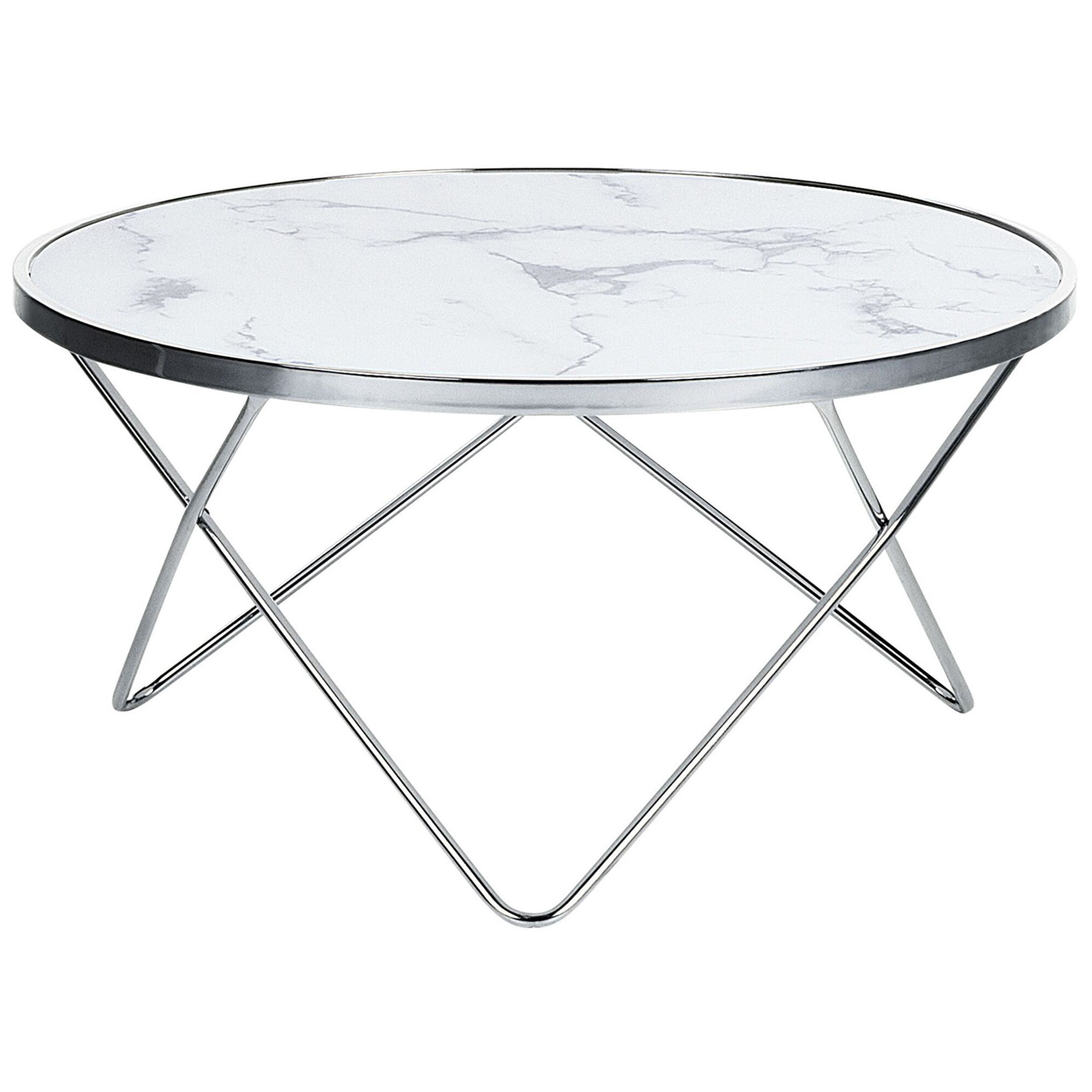 Glamour-tyylinen pyöreä sohvapöytä. Tällä sohvapöydällä tuot olohuoneeseesi art deco -tyyliä ja vuosisadan puolivälin hohtoa. Pyöreän pöydän hopeiset metallipinnijalat ja valkoinen, marmorikuvioitu karkaistu lasitaso antavat muotoilulle ylellisen ja rikkaan ilmeen. Tämä ajaton sohvapöytä täydentää mitä tahansa modernia, glamour- tai retrotyylistä sisustusta kiiltävän viimeistelynsä ansiosta.