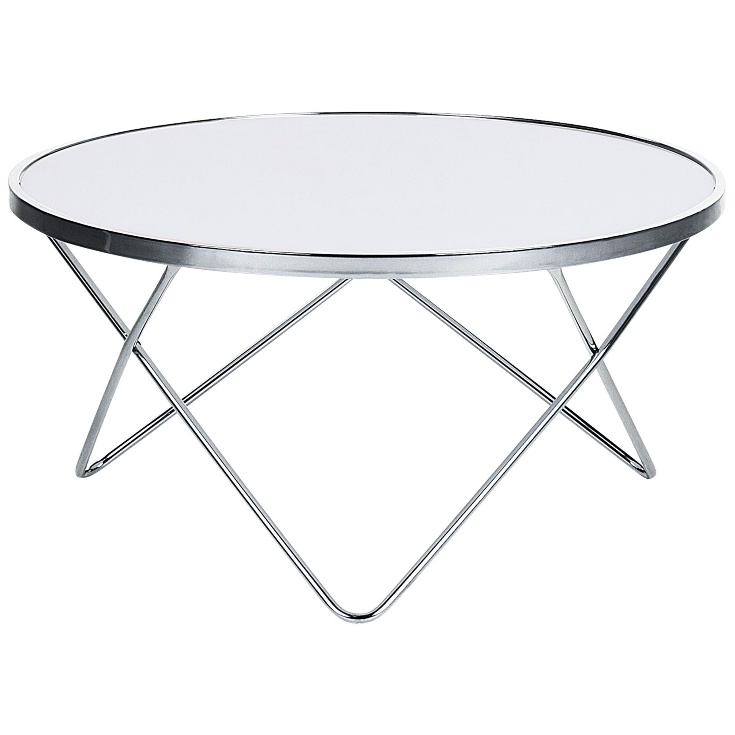 Glamour-tyylinen pyöreä sohvapöytä. Tällä sohvapöydällä tuot olohuoneeseesi art deco -tyyliä ja vuosisadan puolivälin hohtoa. Pyöreän pöydän hopeiset metallipinnijalat ja valkoinen karkaistu lasitaso antavat muotoilulle ylellisen ja rikkaan ilmeen. Tämä ajaton sohvapöytä täydentää mitä tahansa modernia, glamour- tai retrotyylistä sisustusta kiiltävän viimeistelynsä ansiosta.