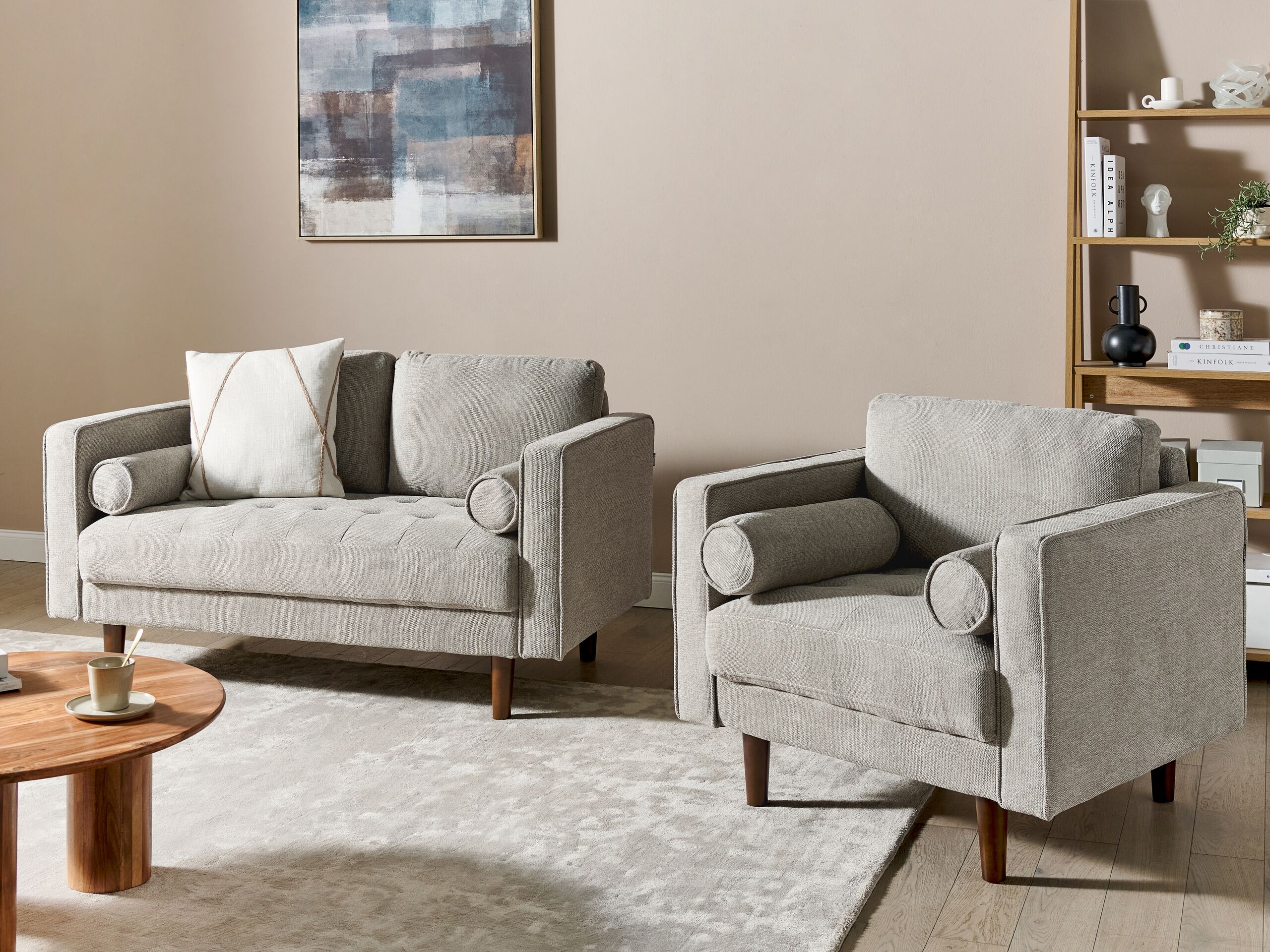 Kangasverhoiltu sohvasetti koristetyynyillä. Uudista asuintilasi tällä ajattomalla sohvaryhmällä, jossa on retrohenkinen vintage-muotoilu, joka sopii useisiin erilaisiin sisustuksiin luoden kotoisan ilmapiirin. Kestävällä polyesterillä verhoiltu sohva ei ainoastaan huou tyyliä, vaan se lupaa myös pitkäikäisyyttä sekä kestävyyttä. Muhkeasti pehmustetut istuimet takaavat sekä mukavuuden että tyylikkyyden. Täydennä kokonaisuus yhdistämällä se yhteensopivien huonekalujen kanssa tyylikkään kokonaisuuden luomiseksi.
