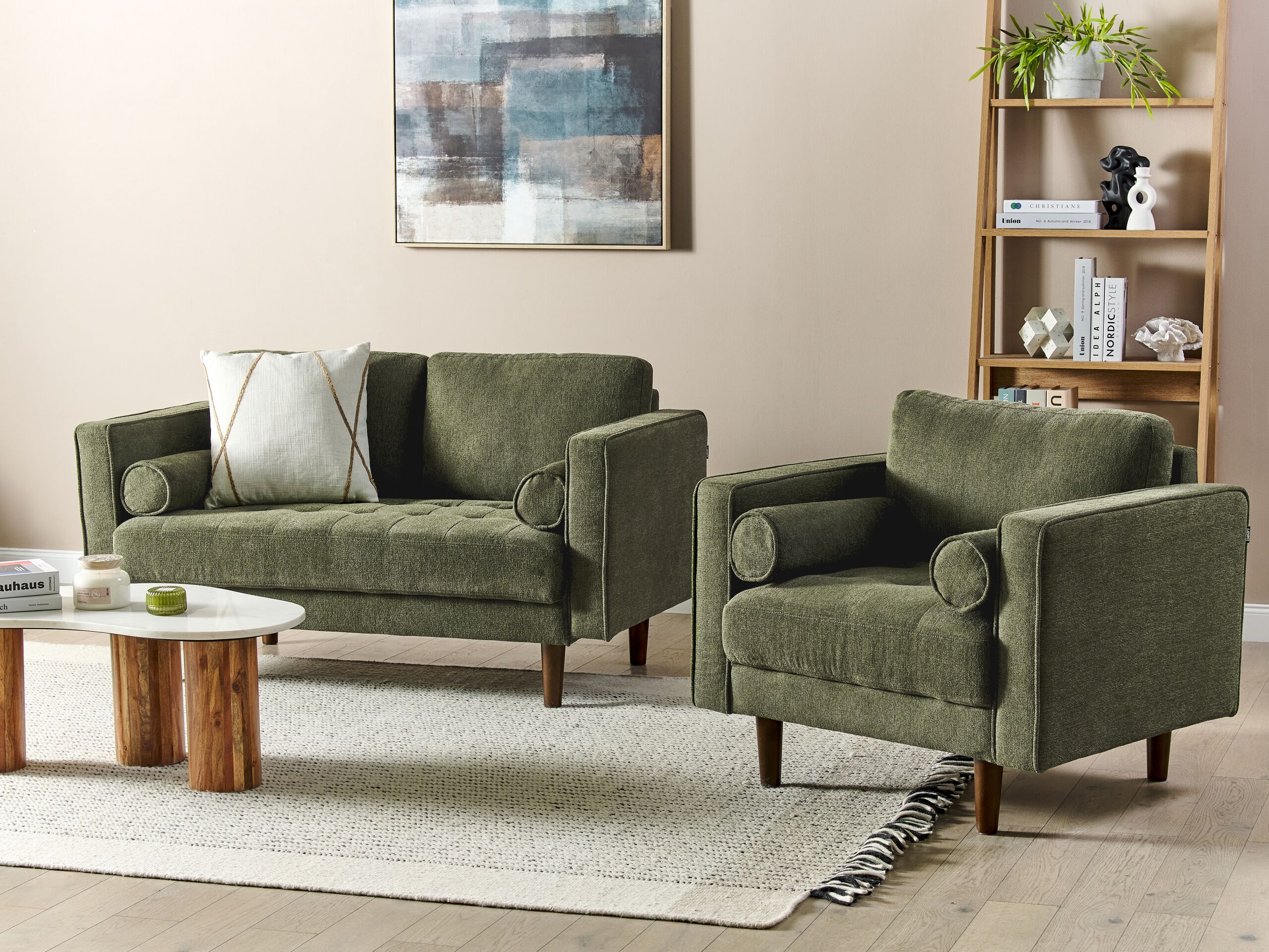 Kangasverhoiltu sohvasetti koristetyynyillä. Uudista asuintilasi tällä ajattomalla sohvaryhmällä, jossa on retrohenkinen vintage-muotoilu, joka sopii useisiin erilaisiin sisustuksiin luoden kotoisan ilmapiirin. Kestävällä polyesterillä verhoiltu sohva ei ainoastaan huou tyyliä, vaan se lupaa myös pitkäikäisyyttä sekä kestävyyttä. Muhkeasti pehmustetut istuimet takaavat sekä mukavuuden että tyylikkyyden. Täydennä kokonaisuus yhdistämällä se yhteensopivien huonekalujen kanssa tyylikkään kokonaisuuden luomiseksi.