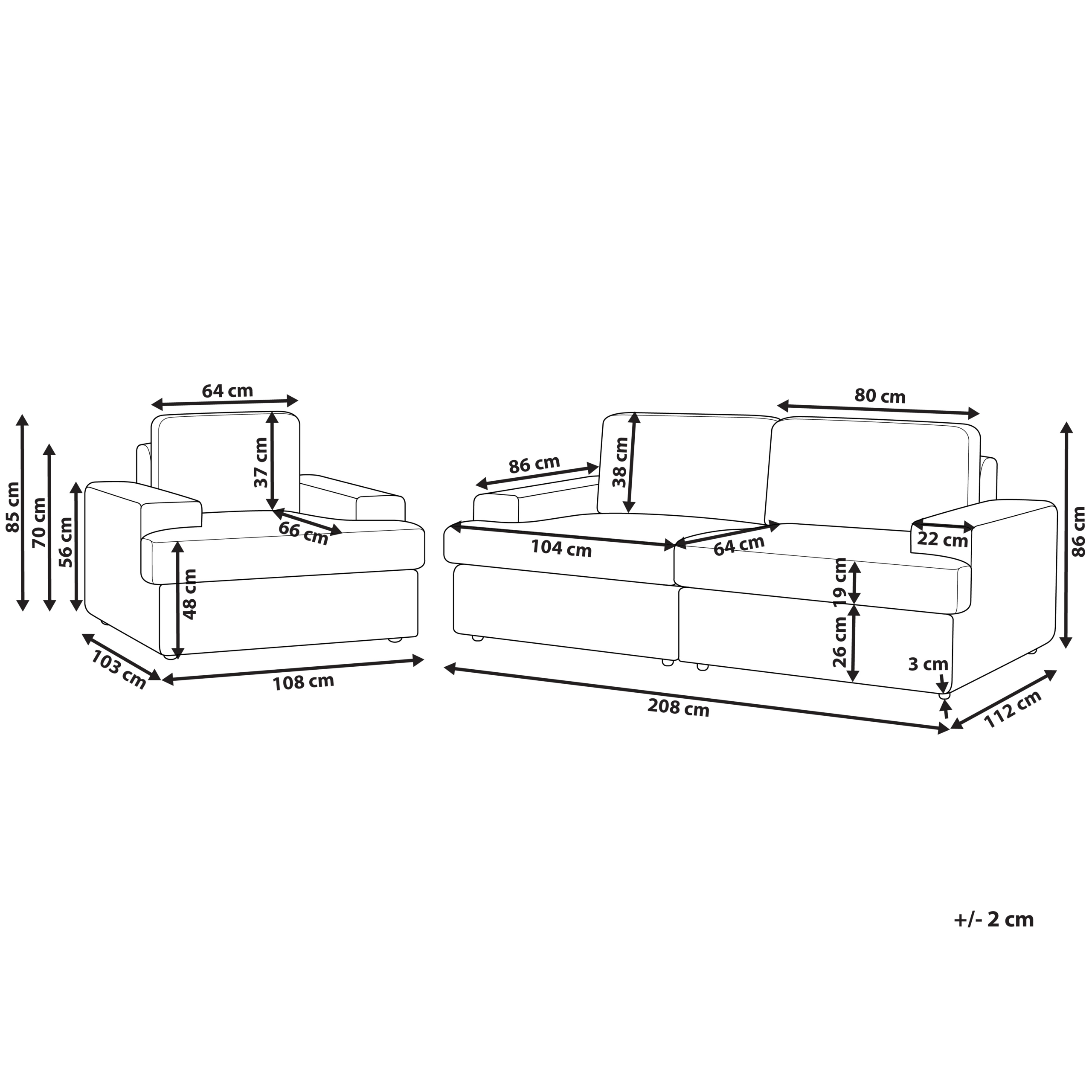 Retrotyylinen verhoiltu sohvasetti. Sisusta olohuoneesi tällä klassisesti muotoillulla sohvaryhmällä, joka täydentää täydellisesti eri tyylejä edustavia olohuoneita. Se koostuu 3-istuttavasta sohvasta sekä nojatuolista. Kestävällä polyesterillä verhoiltu ja vakaalla puisella rungolla varustettu sohvasetti on suunniteltu kestämään useiden vuosien käyttöä. Paksusti pehmustetut istuimet ja selkänojat tekevät niistä mukavat sekä tyylikkäät kalusteet. Yhdistä ne puiseen sohvapöytään ja muuta olohuoneesi täydelliseksi rentoutumispaikaksi.