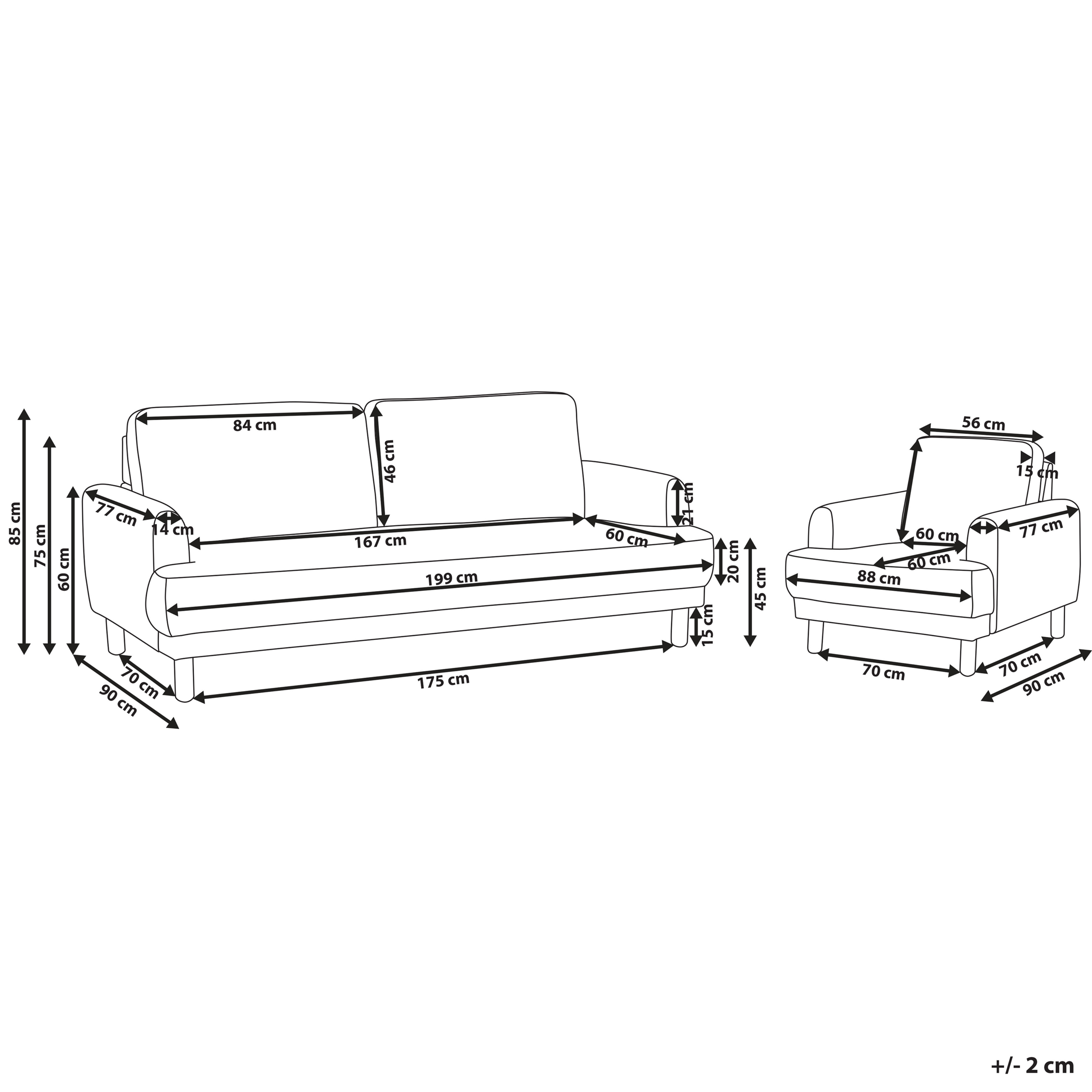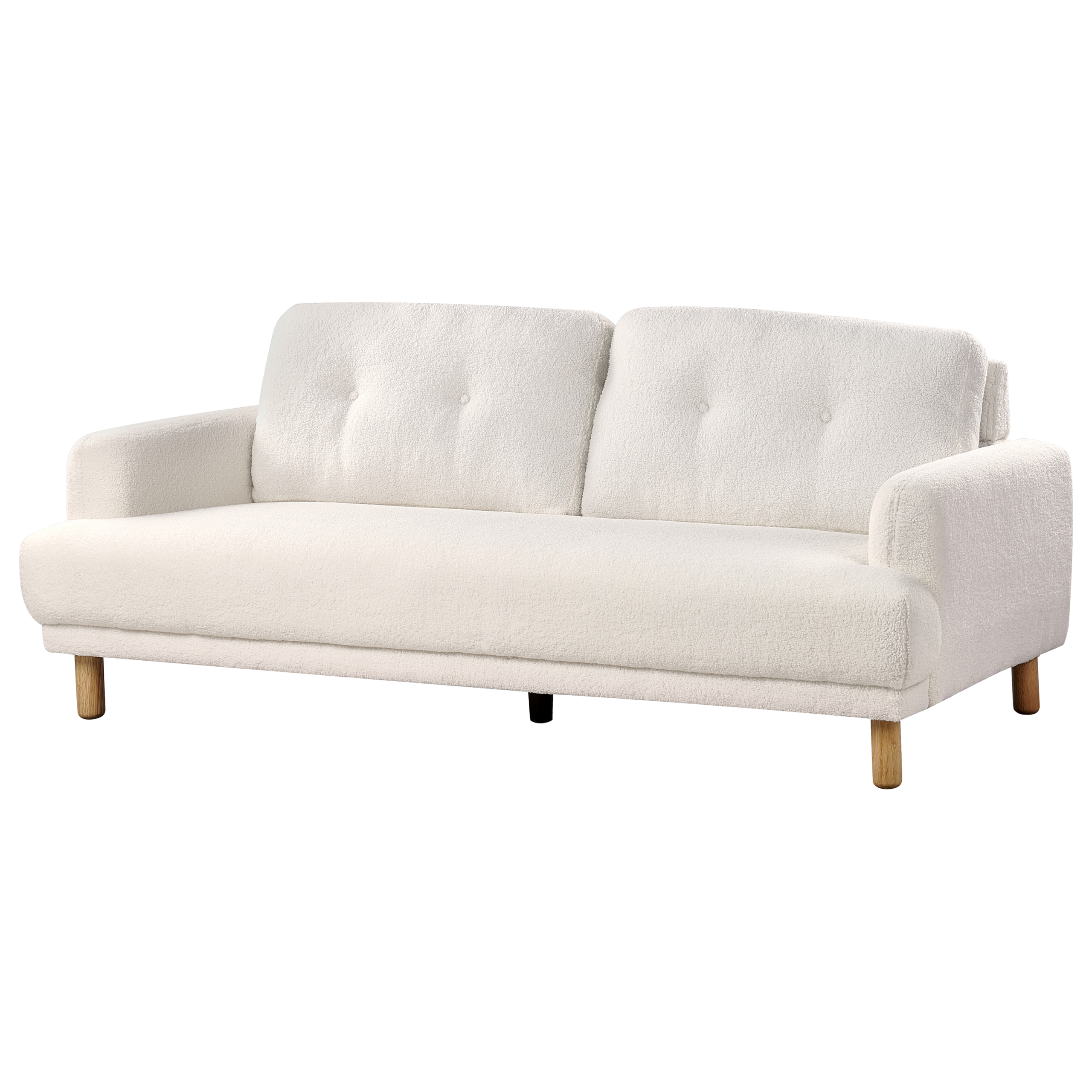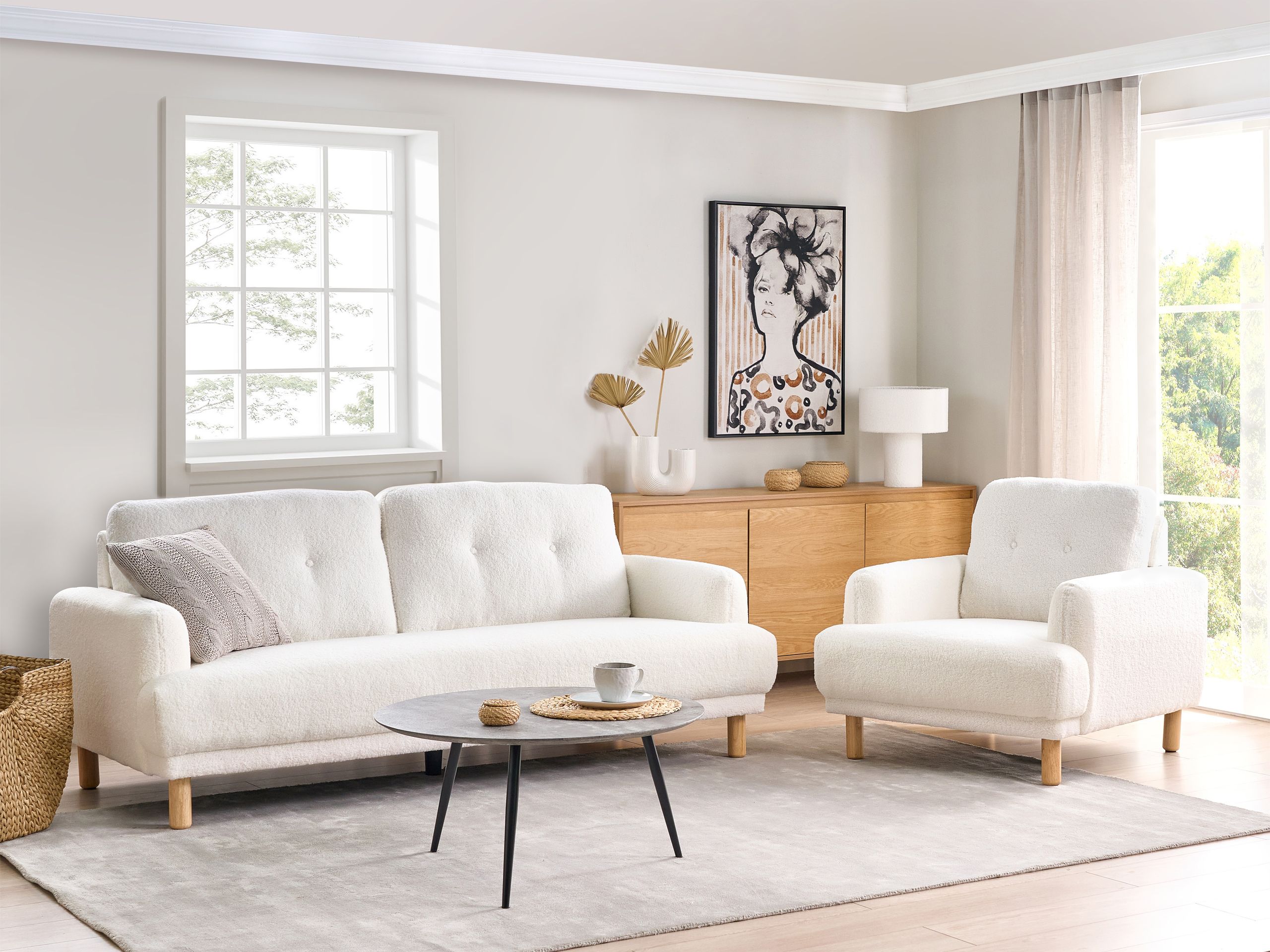 Bukleeverhoiltu sohvasetti puujaloilla. Tämä minimalistinen sohvaryhmä tuo retrotyyliä mihin tahansa tilaan. Setti sisältää 3-istuttavan sohvan ja nojatuolin. Niiden puiset rungot on verhoiltu ajattoman valkoisen värisellä, nyppyisellä bukleekankaalla, joka on kestävää ja laadukasta. Lisäksi selkätyynyjen päälliset ovat irrotettavissa helppoa puhdistusta varten. Vaaleat puujalat korostavat setin verhoilun väriä ja takaavat vakauden. Paksusti pehmustetut istuimet, puhdaslinjaiset muodot ja nappikoristellut selkänojat luovat mukavan kokonaisuuden, joka sulautuu useisiin sisustustyyleihin.