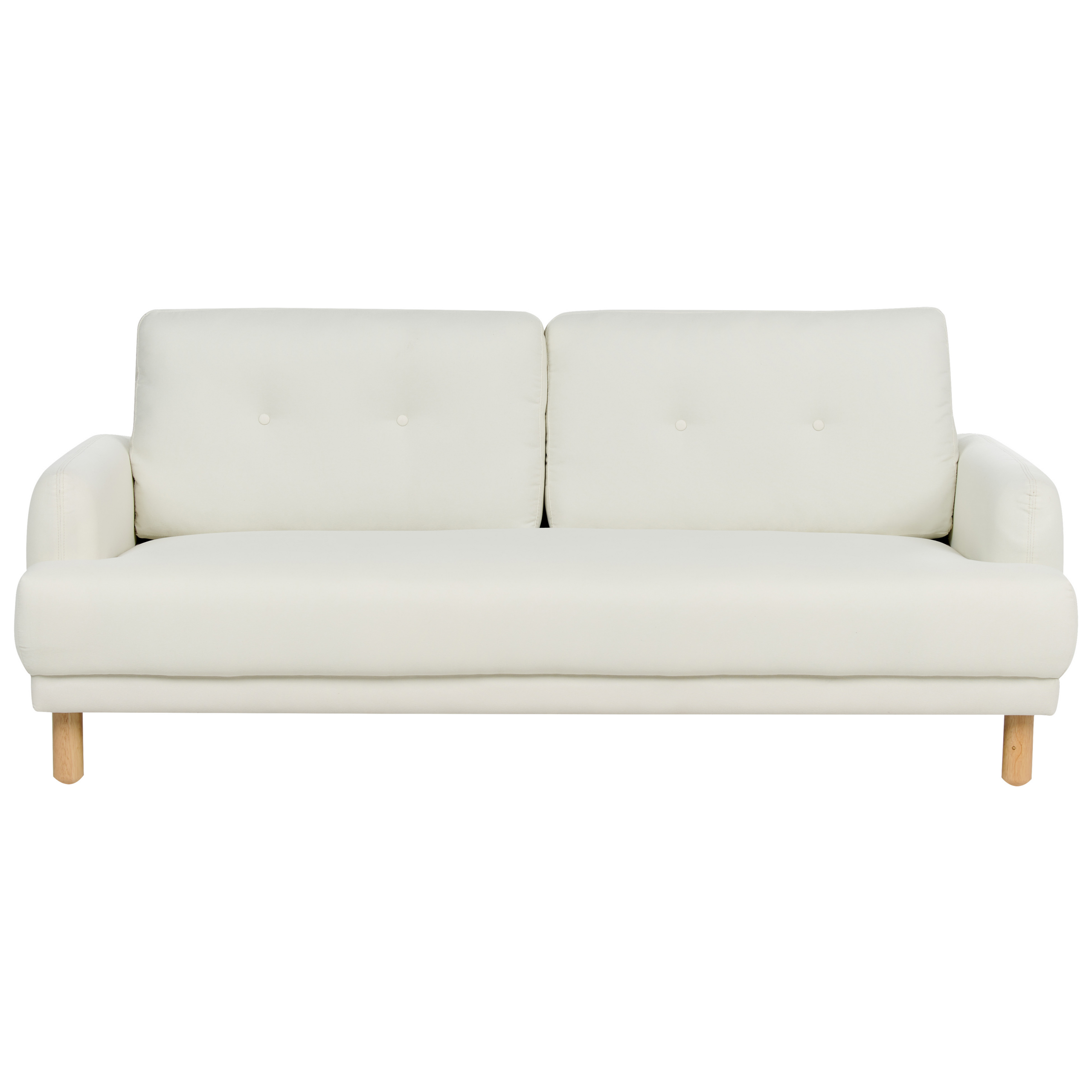 Kangasverhoiltu sohvasetti puujaloilla. Tämä minimalistinen sohvaryhmä tuo retrotyyliä mihin tahansa tilaan. Setti sisältää 3-istuttavan sohvan ja nojatuolin. Niiden puiset rungot on verhoiltu ajattoman luonnonvalkoisen värisellä kankaalla, joka on kestävää ja laadukasta. Lisäksi selkätyynyjen päälliset ovat irrotettavissa helppoa puhdistusta varten. Vaaleat puujalat korostavat setin verhoilun väriä ja takaavat vakauden. Paksusti pehmustetut istuimet, puhdaslinjaiset muodot ja nappikoristellut selkänojat luovat mukavan kokonaisuuden, joka sulautuu useisiin sisustustyyleihin.