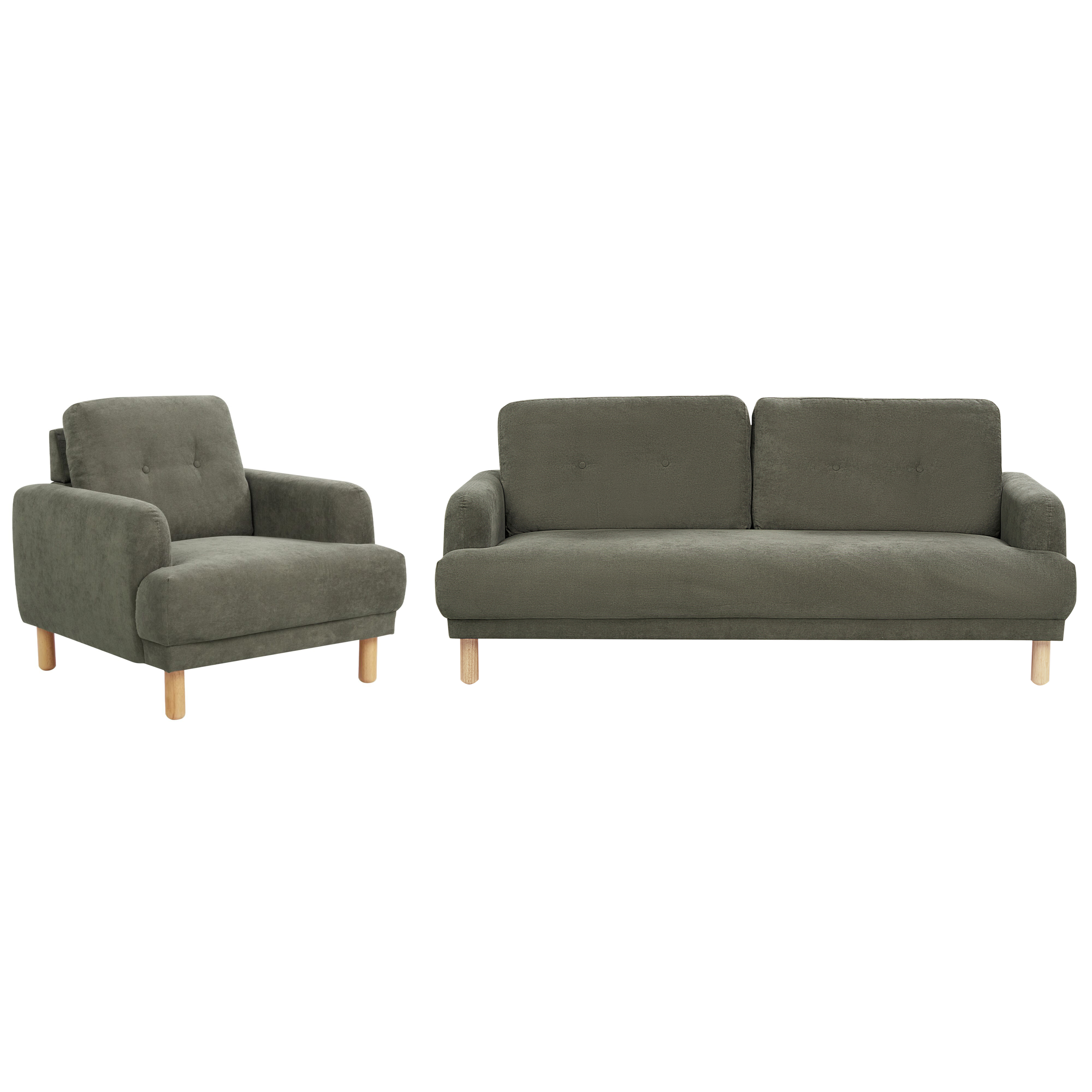 Vakosamettiverhoiltu sohvasetti puujaloilla. Tämä minimalistinen sohvaryhmä tuo retrotyyliä mihin tahansa tilaan. Setti sisältää 3-istuttavan sohvan ja nojatuolin. Niiden puiset rungot on verhoiltu ajattoman tummanvihreän värisellä vakosametilla, joka on kestävää ja laadukasta. Lisäksi selkätyynyjen päälliset ovat irrotettavissa helppoa puhdistusta varten. Vaaleat puujalat korostavat setin verhoilun väriä ja takaavat vakauden. Paksusti pehmustetut istuimet, puhdaslinjaiset muodot ja nappikoristellut selkänojat luovat mukavan kokonaisuuden, joka sulautuu useisiin sisustustyyleihin.