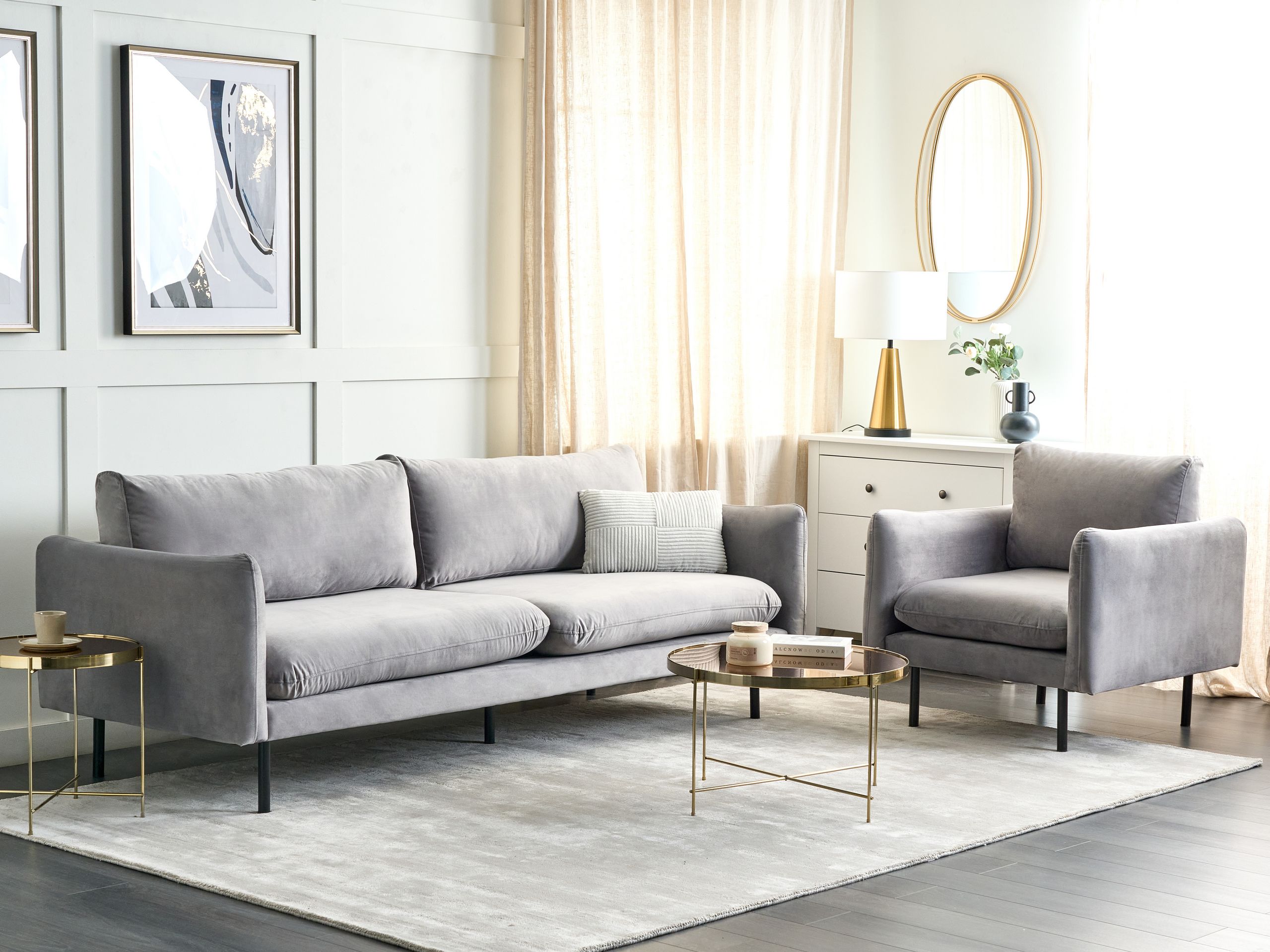 Retrotyylinen sohvasetti neljälle. Tämä 4-istuttava sohvaryhmä muuttaa minkä tahansa olohuoneen rentoutumisen ja vapaa-ajan viettopaikaksi. Runsaasti pehmustettujen istuin- ja selkätyynyjen ansiosta setti on pehmeä ja mukava. Kalusteiden kestävät puurungot ja alumiiniset jalat takaavat vakauden, kun taas pehmeä samettiverhoilu antaa niille tyylikkään ilmeen erottuvan kiiltonsa ansiosta. Sohvasetistä tulee hetkessä minkä tahansa sisustuksen kohokohta, olipa kyseessä sitten moderni, perinteinen tai industriaalinen sisustus.