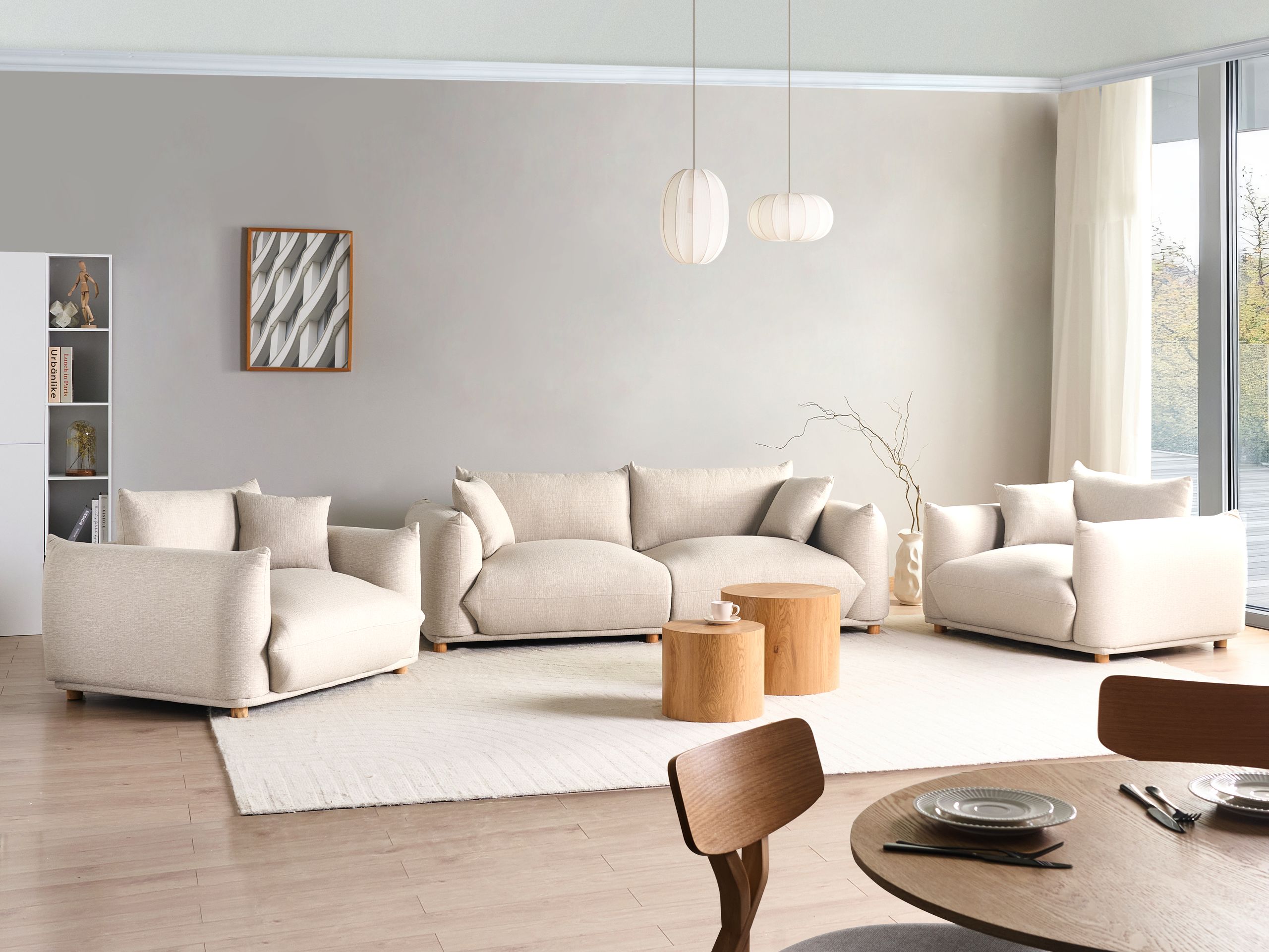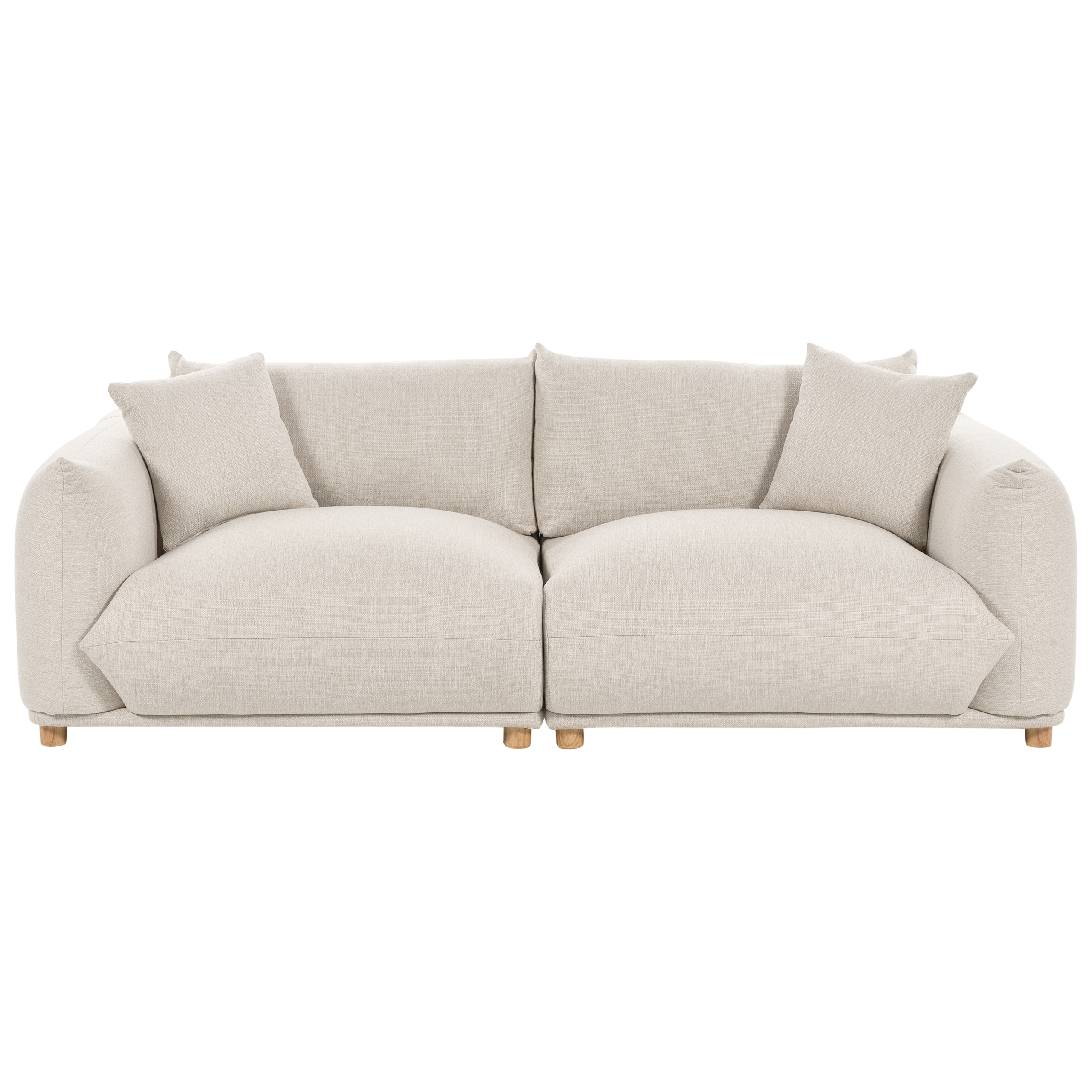 Moderni muhkea sohvaryhmä koristetyynyillä. Kohota olohuoneesi sisustusta ja lisää siihen täydellinen yhdistelmä modernia tyyliä ja mukavuutta tällä sohvaryhmällä, joka sisältää 3-istuttavan sohvan ja kaksi nojatuolia. Kestävällä ja pehmeällä polyesterikankaalla verhoillut nojatuolit ja sohva huokuvat eleganssia hillityllä vaaleanbeigellä värillään, ja muhkean pehmustuksen ansiosta ne tarjoavat miellyttävän paikan rentoutumiseen. Lyhyet, tukevat kumipuujalat takaavat vakauden ja korostavat syviä, leveitä istuimia. Yhteensopivat koristetyynyt parantavat kalusteiden ulkonäköä ja takaavat ylellisen istumiskokemuksen. Uppoudu mukavuuteen ja tunne, kuinka päivän huolet sulavat pois.