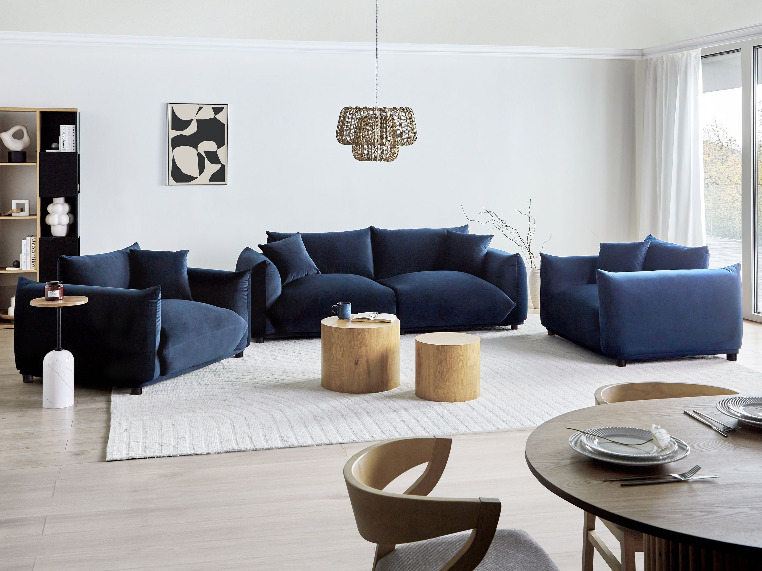 Moderni muhkea sohvaryhmä koristetyynyillä. Kohota olohuoneesi sisustusta ja lisää siihen täydellinen yhdistelmä modernia tyyliä ja mukavuutta tällä sohvaryhmällä, joka sisältää 3-istuttavan sohvan ja kaksi nojatuolia. Kestävällä ja pehmeällä samettikankaalla verhoillut nojatuolit ja sohva huokuvat eleganssia ajattomalla tummansinisellä värillään, ja muhkean pehmustuksen ansiosta ne tarjoavat miellyttävän paikan rentoutumiseen. Lyhyet, tukevat kumipuujalat takaavat vakauden ja korostavat syviä, leveitä istuimia. Yhteensopivat koristetyynyt parantavat kalusteiden ulkonäköä ja takaavat ylellisen istumiskokemuksen. Uppoudu mukavuuteen ja tunne, kuinka päivän huolet sulavat pois.