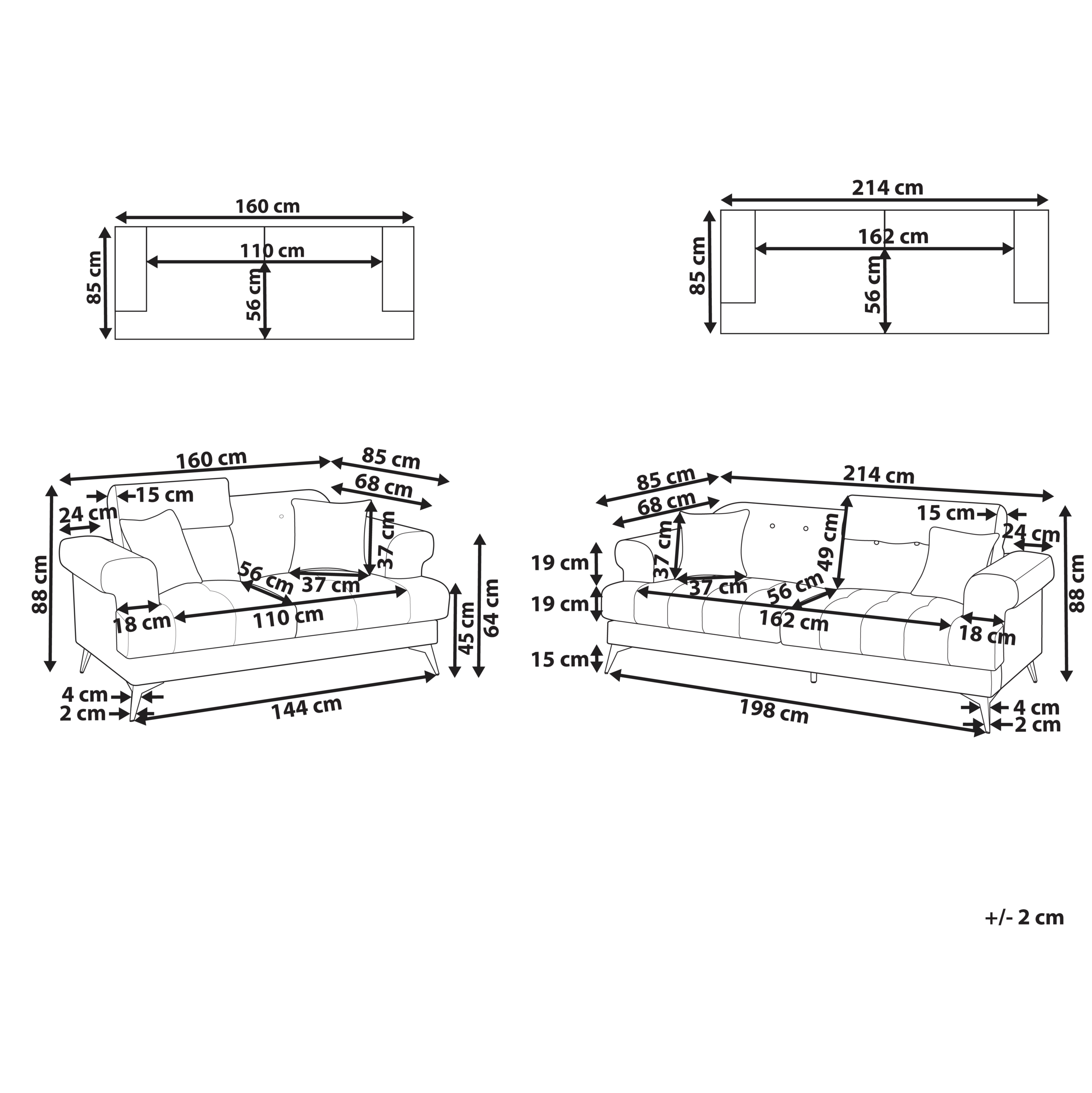 2-istuttavan sohvan mitat: 160x85x88