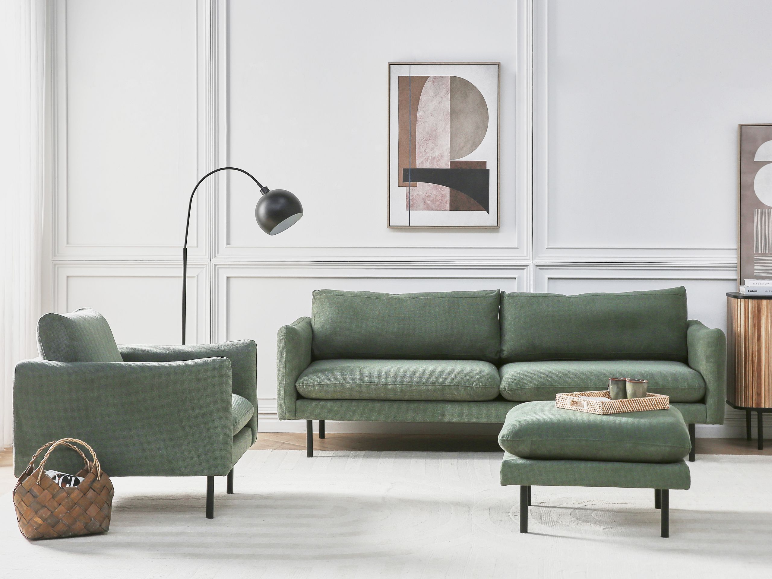 Ominaisuudet: Paksusti pehmustettu mukavuuden takaamiseksi, Tuo tyyliä sisustukseen, Vankka rungon rakenne, Täysin verhoiltu, Jaloissa tapit lattian suojaamiseen