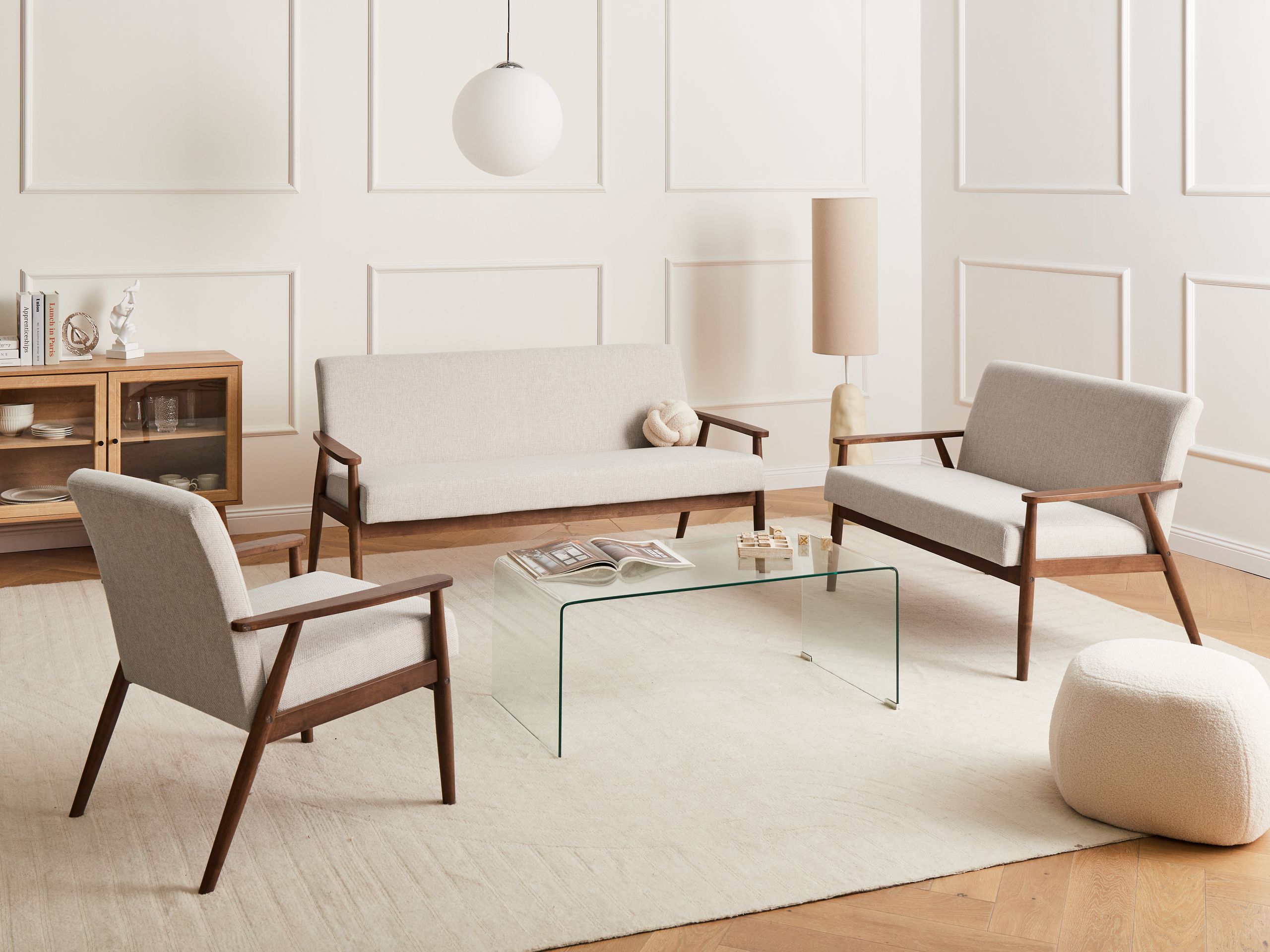Retrotyylinen sohvaryhmä puisilla käsinojilla. Päivitä asuintilaa tällä tyylikkäällä ja mukavalla sohvaryhmällä, joka sisältää 3-istuttavan sohvan, 2-istuttavan sohvan ja nojatuolin. Kalusteet on verhoiltu pehmeällä, teksturoidulla polyesterikankaalla ja ne tarjoavat viihtyisän paikan rentoutumiseen. Tukevat puurungot ja puiset käsinojat tuovat ripauksen luonnollista lämpöä ja korostavat vuosisadan puolivälin modernia charmia. Täydellinen olohuoneeseen tai lukunurkkaukseen, yhdistäen vaivattomasti hienostuneisuuden ja mukavuuden.