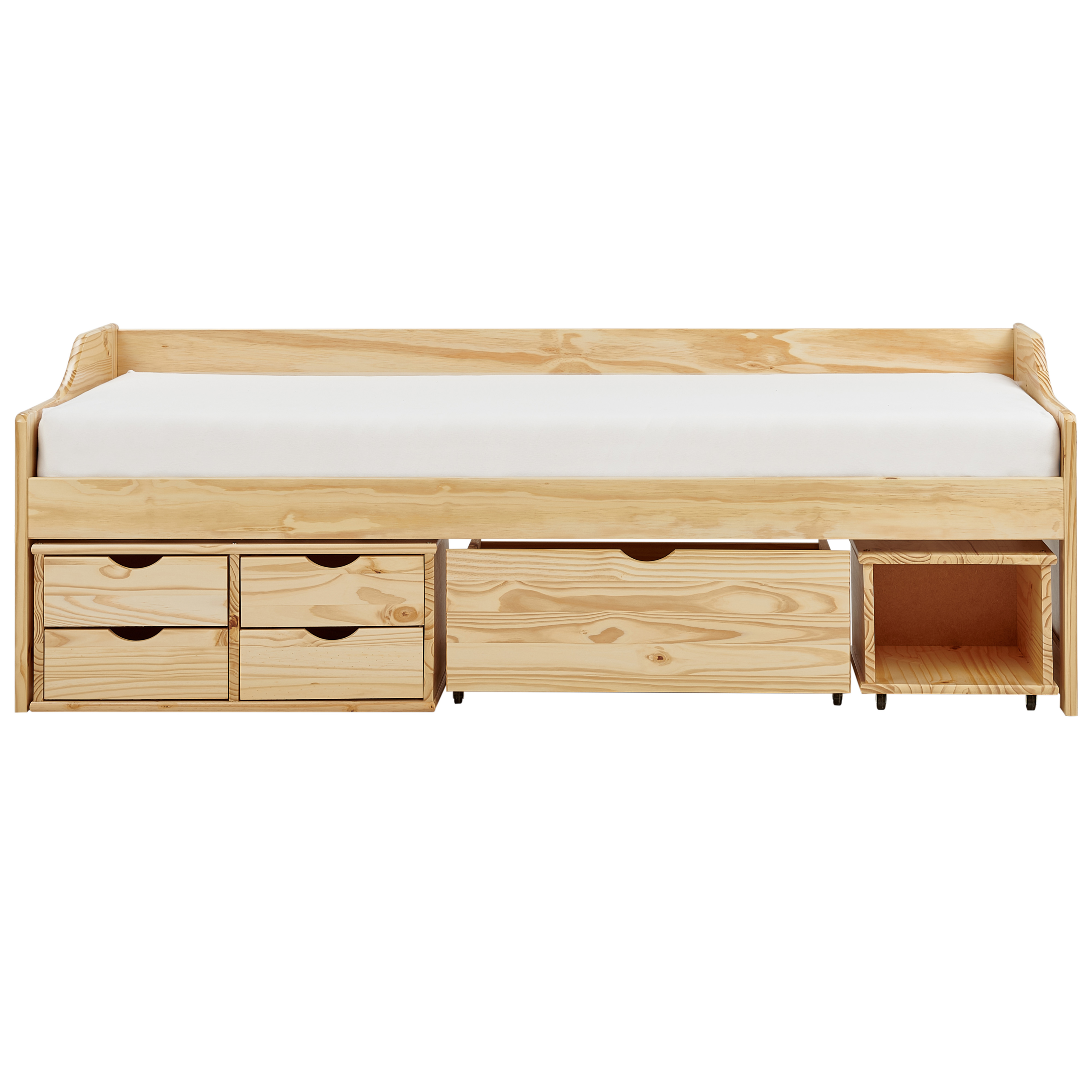 Skandinaavinen vuode vetolaatikoilla. Tämä yhden hengen sänky sulautuu mihin tahansa sisustukseen ja on erinomainen valinta etenkin lastenhuoneeseen. Se on valmistettu kestävästä männystä, jonka viimeistely on jätetty luonnolliseksi, jolloin puun vaalea sävy pääsee täyteen loistoonsa. Sängyssä on neljän laatikon rykelmä pienemmille leluille tai tarvikkeille sekä suurempi laatikko ja avoin lokero, joista kummassakin on pyörät helppoa liikuttelua varten. Ne tarjoavat runsaasti tilaa isommille leluille tai vaikka ylimääräisille tyynyille.