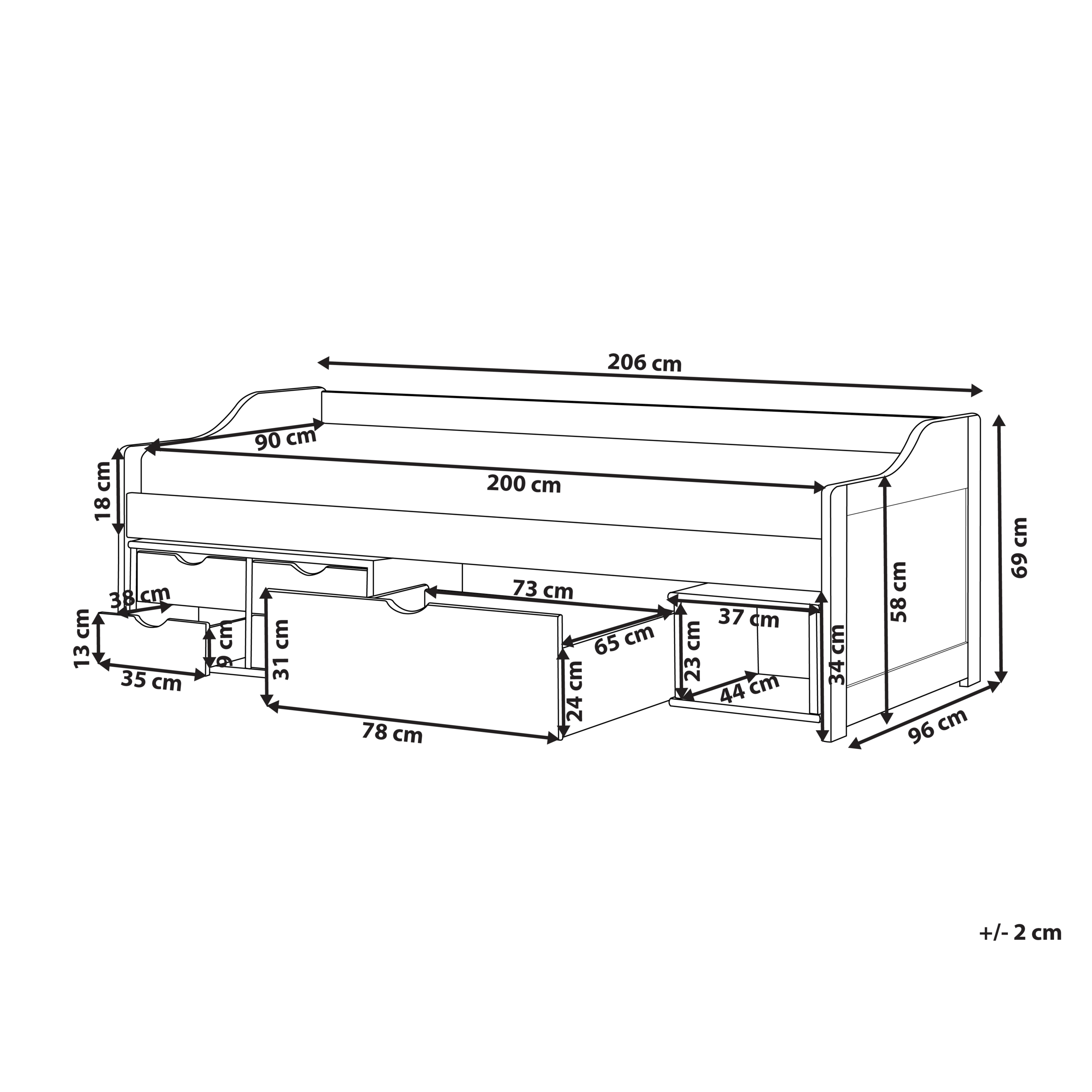 Skandinaavinen vuode vetolaatikoilla. Tämä yhden hengen sänky sulautuu mihin tahansa sisustukseen ja on erinomainen valinta etenkin lastenhuoneeseen. Se on valmistettu kestävästä, valkoiseksi maalatusta männystä. Sängyssä on neljän laatikon rykelmä pienemmille leluille tai tarvikkeille sekä suurempi laatikko ja avoin lokero, joista kummassakin on pyörät helppoa liikuttelua varten. Ne tarjoavat runsaasti tilaa isommille leluille tai vaikka ylimääräisille tyynyille.