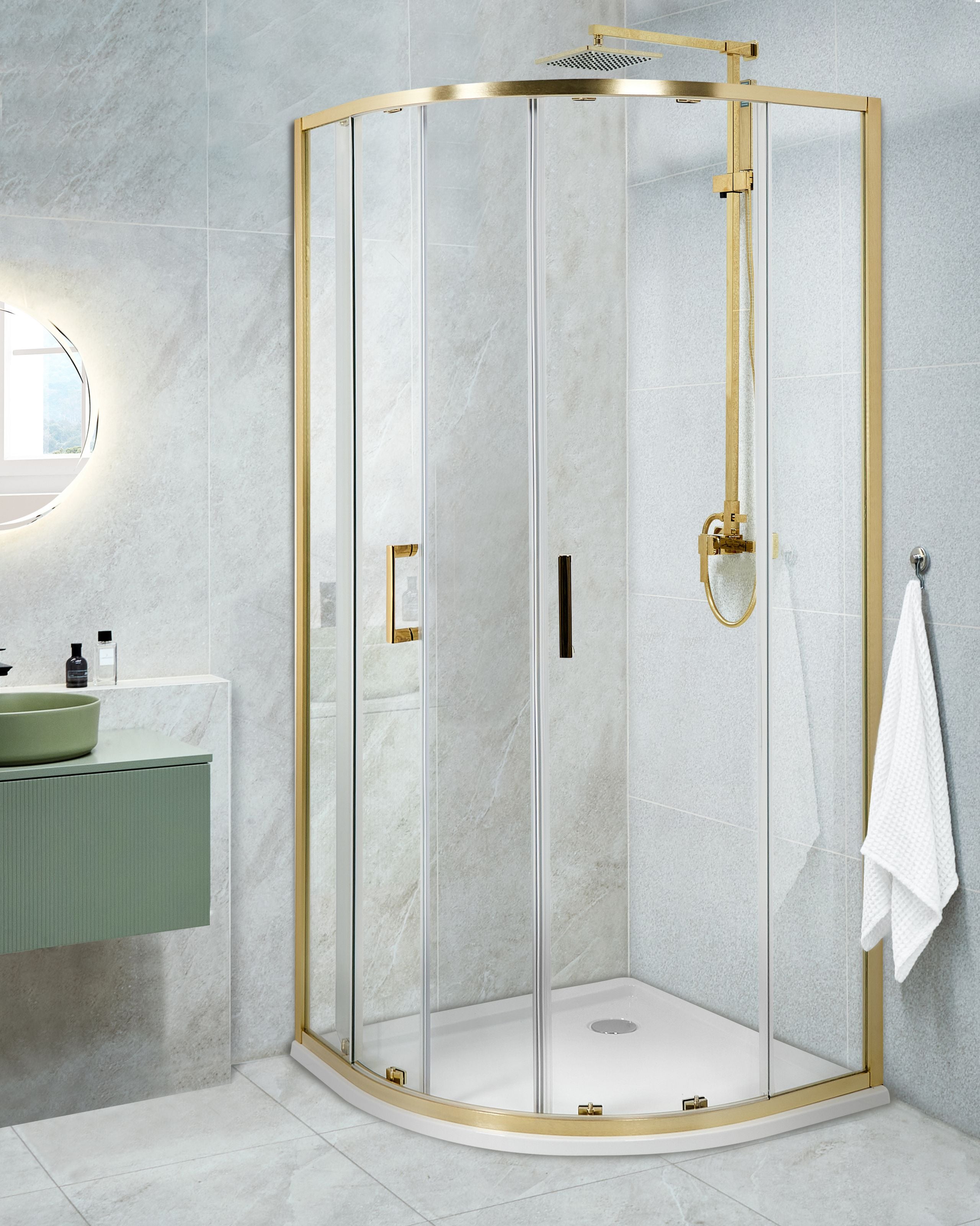 Puolipyöreä suihkukulma liukuovilla. Pidä kylpyhuoneestasi huolta ja varusta se tällä puolipyöreällä suihkunurkalla. Kahden liukuoven ansiosta se estää veden pääsyn muualle kylpyhuoneeseen. Laadukkaasta karkaistusta lasista valmistetut seinät kestävät useita vuosia myös ilman päivittäistä ylläpitoa. Kullanvärinen alumiinirunko suojaa suihkunurkkaa vaurioilta ja korostaa sen modernia muotoilua.