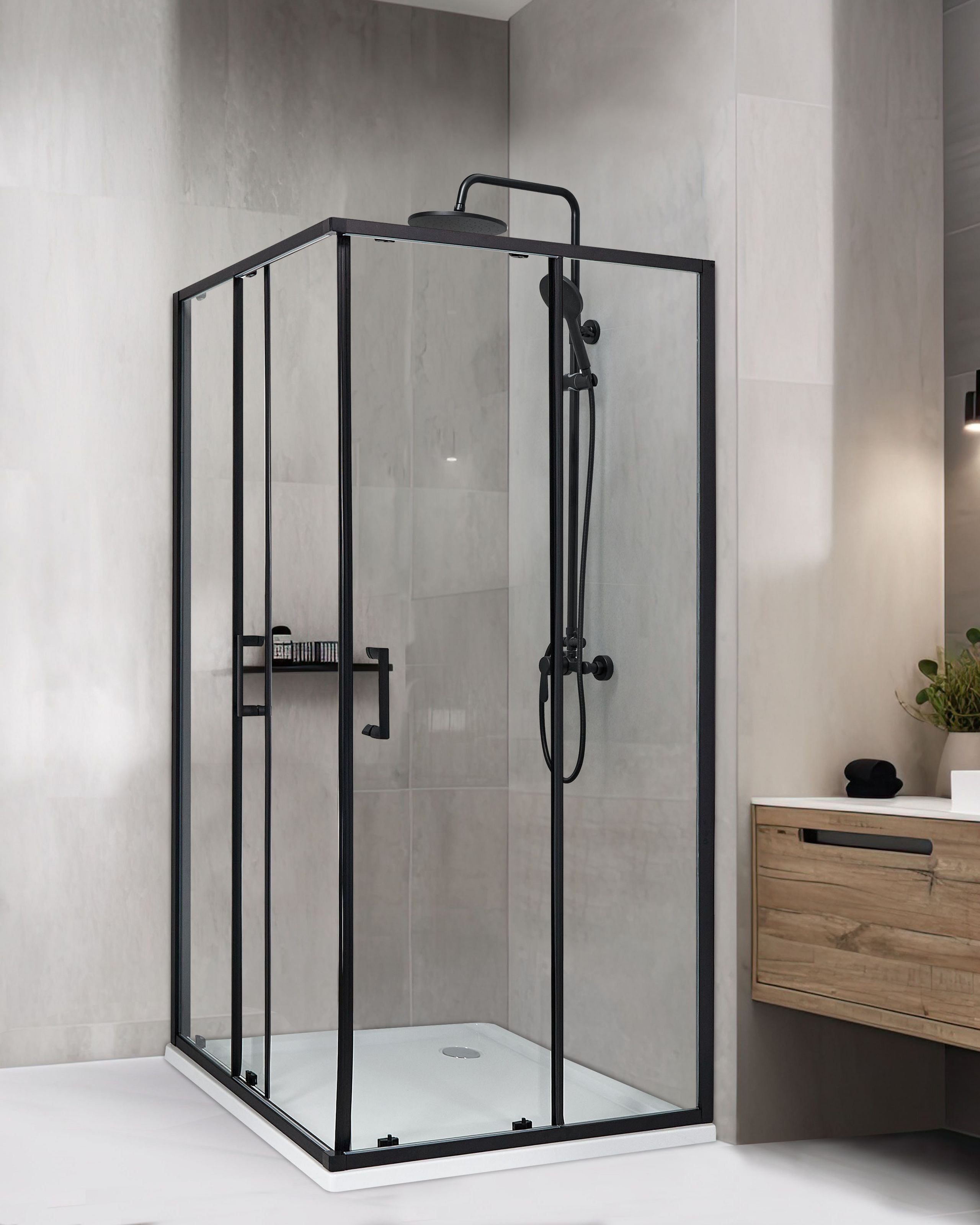 Kaksiseinäinen suihkukulma liukuovilla. Piristä kylpyhuonettasi ja lisää siihen käytännöllisyyttä tällä kauniilla, nelikulmaisella suihkunurkalla. Korkealaatuisesta karkaistusta lasista valmistetut seinät varmistavat kestävyyden, ja musta alumiinirunko korostaa suihkunurkan modernia muotoilua. Kaksi kahvalla varustettua liukuovea suojaa suihkun ulkopuolista tilaa vedeltä ja lialta, joten sinun ei tarvitse pelätä liukastuvasi astuessasi ulos suihkusta.