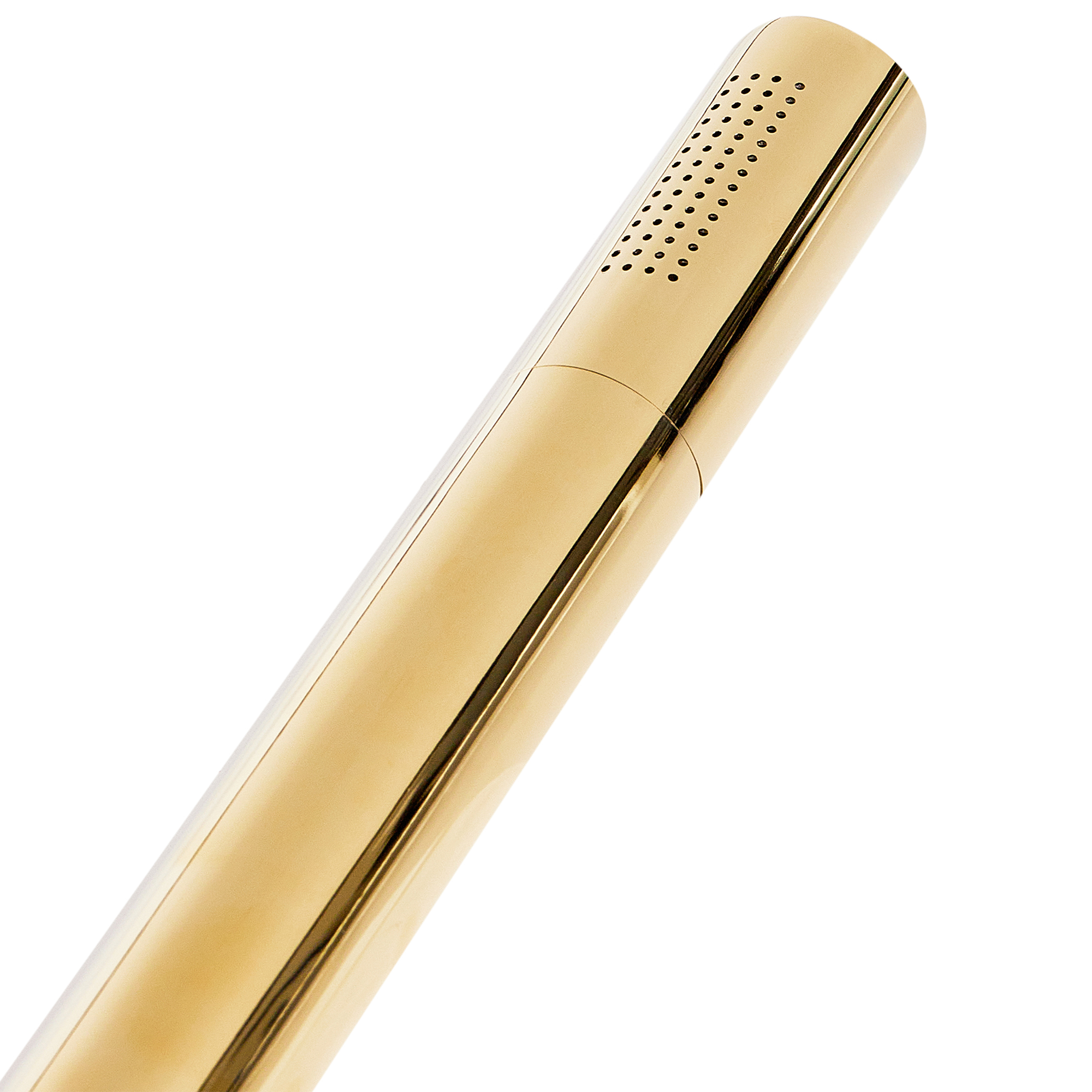 Minimalistinen pyöreä käsisuihku. Tämä pyöreä käsisuihku yhdistää toimivan muotoilun ja kestävyyden. Se on valmistettu vankasta messingistä ja viimeistelty kiiltävällä kullanvärisellä pinnalla, joka tuo modernia ilmettä ja sulautuu monenlaisiin kylpyhuoneisiin, erityisesti minimalistisiin. Se on helppo käyttää, kevyt ja sopii kaikille, jotka arvostavat sekä muotoa että toimintoa. Suihkupäässä on yksi suihkutoiminto, minkä ansiosta se takaa mutkattoman mutta tehokkaan suihkukokemuksen.