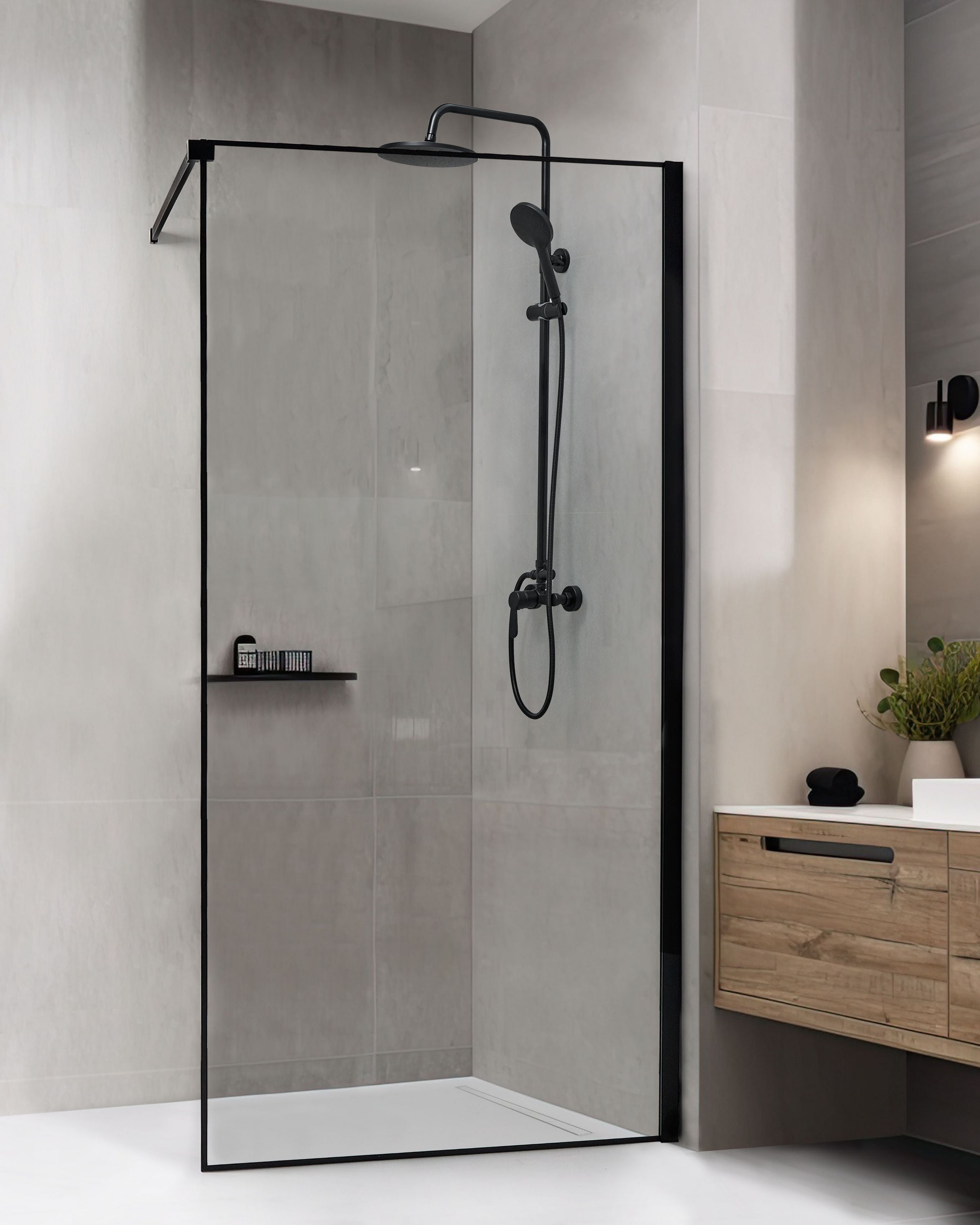 Minimalistinen suihkutilan lasiseinä. Lisää kylpyhuoneeseesi modernia tunnelmaa tällä tyylikkäällä mutta minimalistisella suihkuseinällä. Musta runko on valmistettu alumiinista ja ruostumattomasta teräksestä, mikä tekee siitä erityisen kestävän. Sen yksi seinä on valmistettu karkaistusta lasista, joka takaa tilan asianmukaisen suojan ja on samalla helppohoitoinen. Muotoilunsa ansiosta suihkuseinä on yhdistettävissä erilaisiin sisustustuotteisiin ja kalusteisiin.