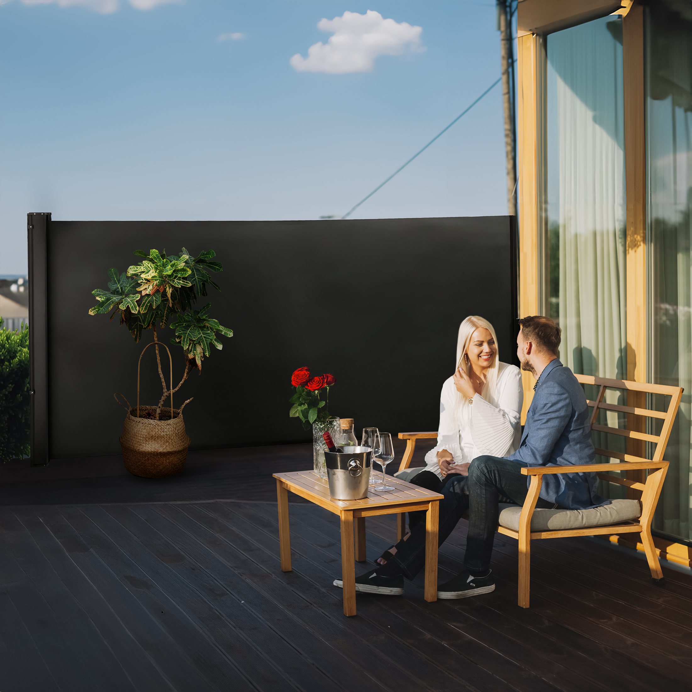 - Koko 300 x 200 cm kattaa tehokkaasti UV-säteilyn ja tarjoaa miellyttävän viileyden myös kuumimpina päivinä. Lisävarjostin sivulla suojaa tuulelta ja uteliailta katseilta.