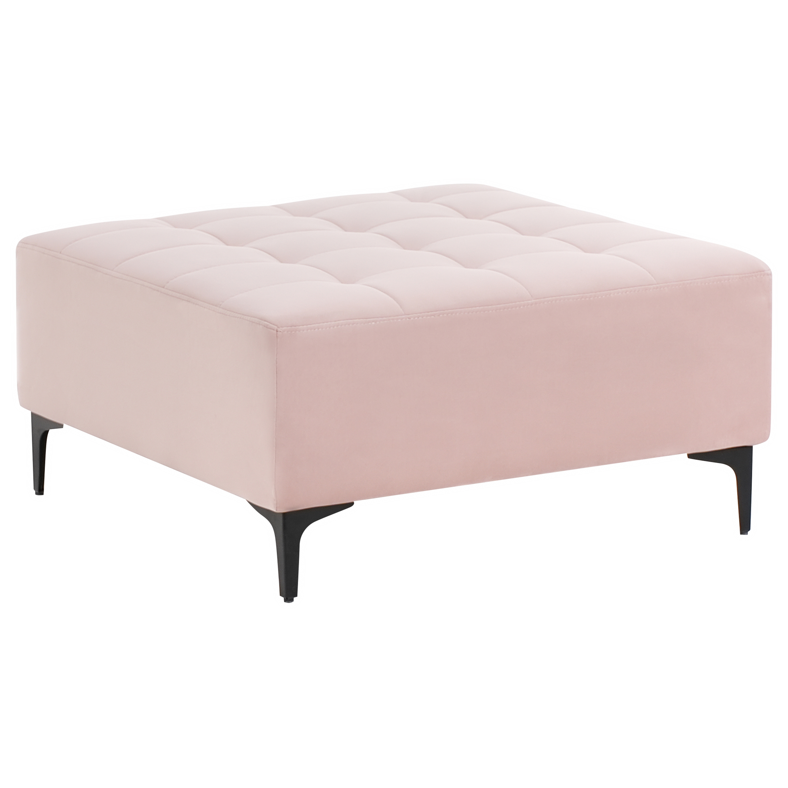 Moderni tuftattu rahi. Puhtaat linjat ja mukavuus ovat tämän suuren rahin ominaisia piirteitä. Sen runko on verhoiltu kokonaan korkealaatuisella samettikankaalla ja viimeistelty tyylikkäällä tuftauksella. Lempeä pastellipinkki väri sopii useisiin sisustuksiin ja värimaailmoihin. Muotoilunsa ansiosta se voidaan yhdistää malliston muihin kalusteisiin sopivan istuinkokonaisuuden luomiseksi. Se on erittäin vakaa mustien metallijalkojensa ansiosta. Rahi toimii loistavasti sekä lisäistuimena, jalkatukena että sivupöytänä.