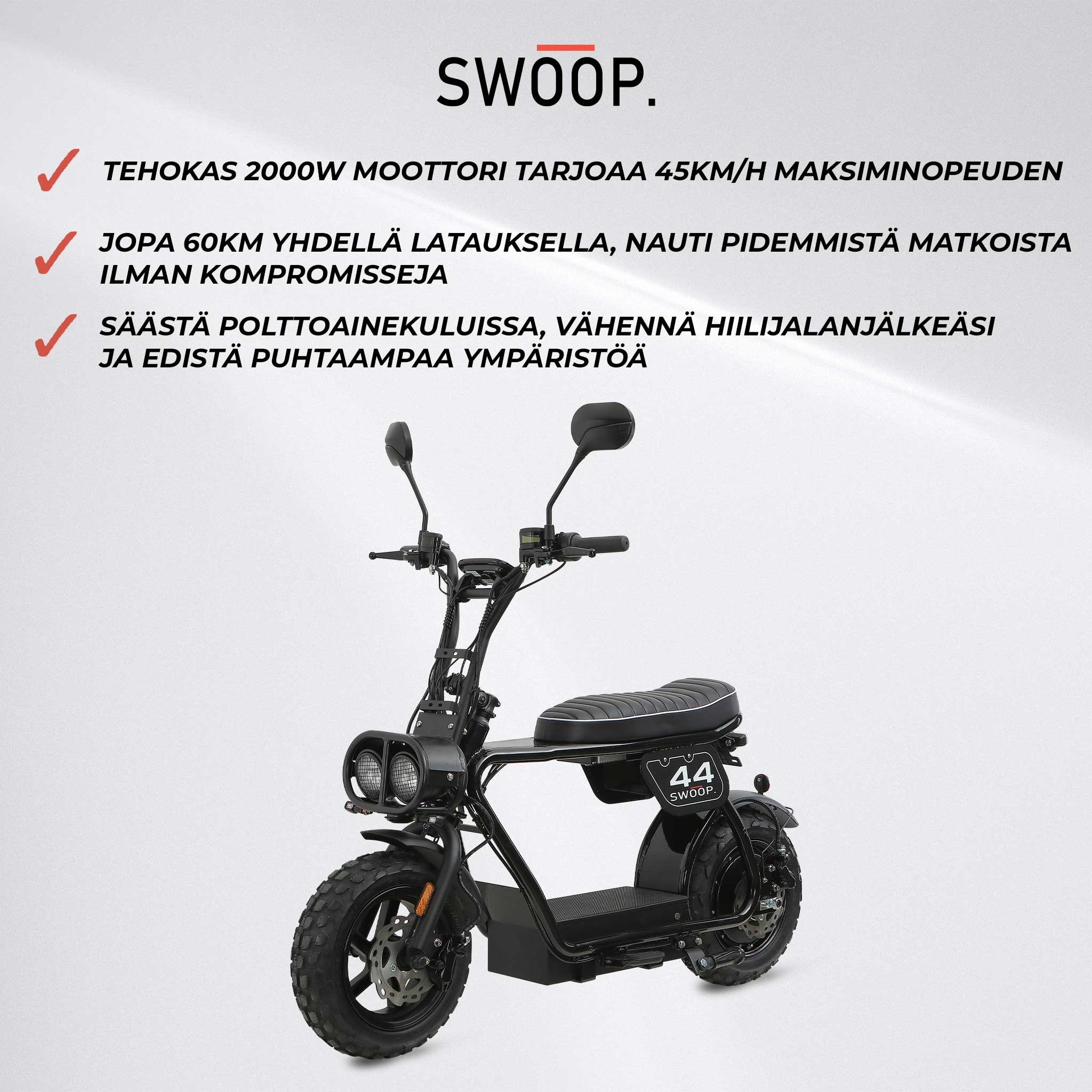 Koe tulevaisuuden kuljetusmuoto Swoop Sähkömopo Turbo 2000W:n kanssa, yhdistäen viimeisintä tekniikkaa tyylikkääseen suunnitteluun vertaansa vailla olevan ajokokemuksen saavuttamiseksi.