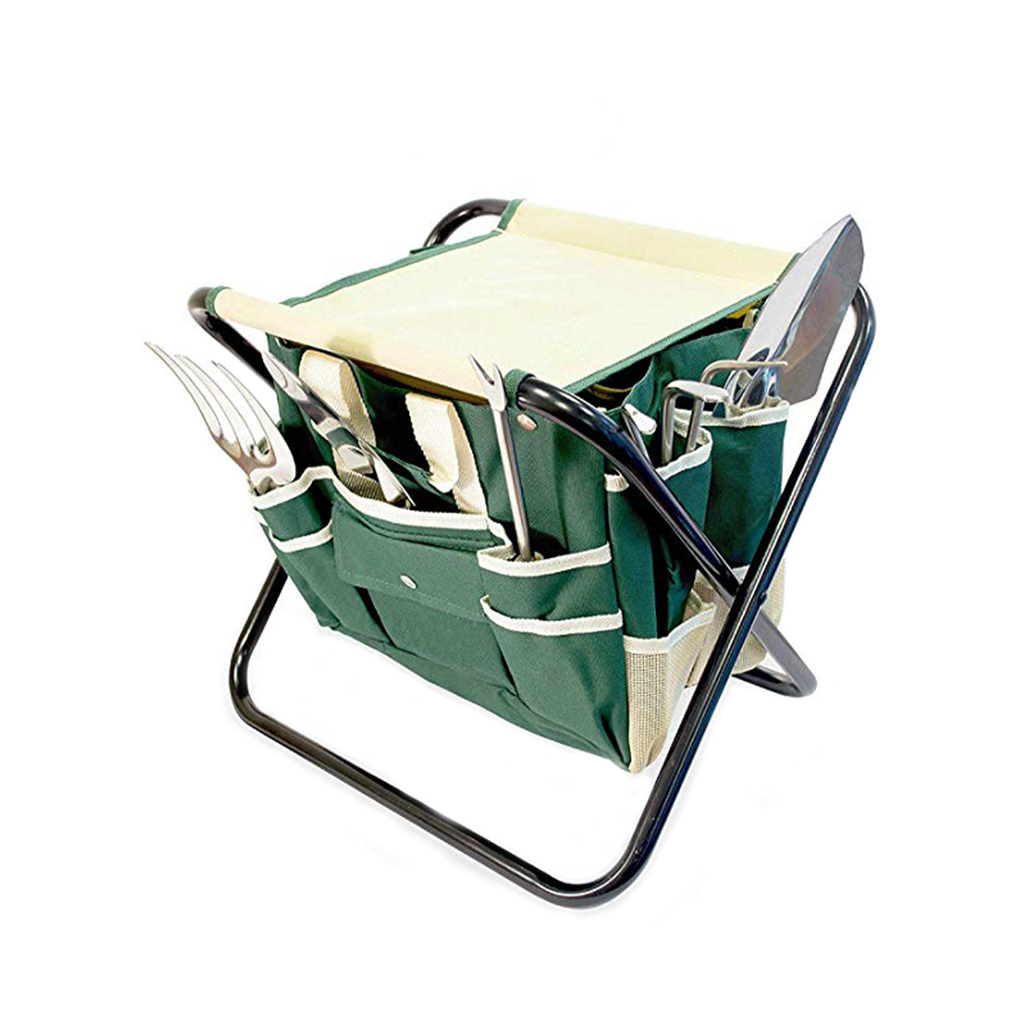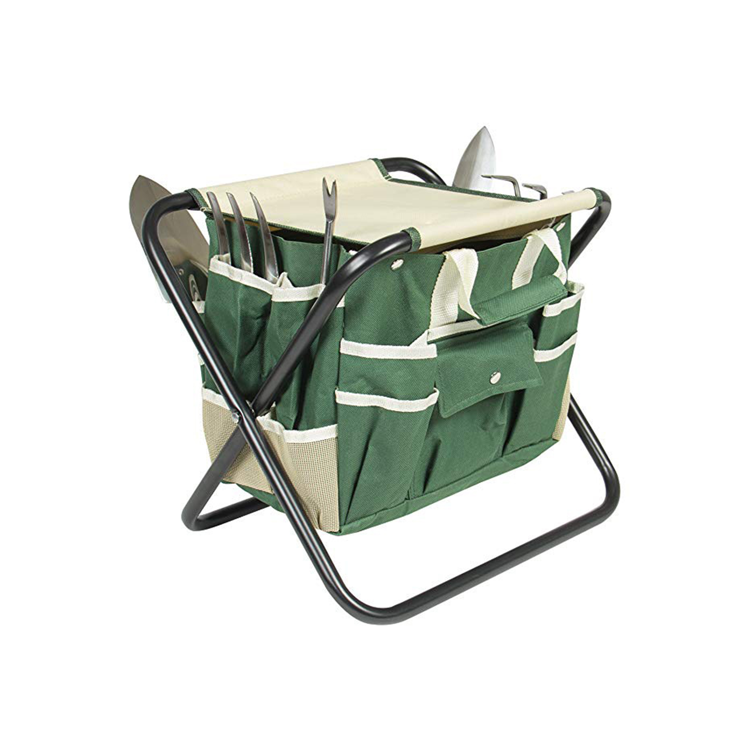 - Käytännöllinen, kokoontaitettava jakkara, jossa on kangasistuin, työkalutaskuilla varustettu laukku ja sarja tärkeitä puutarhatyökaluja.