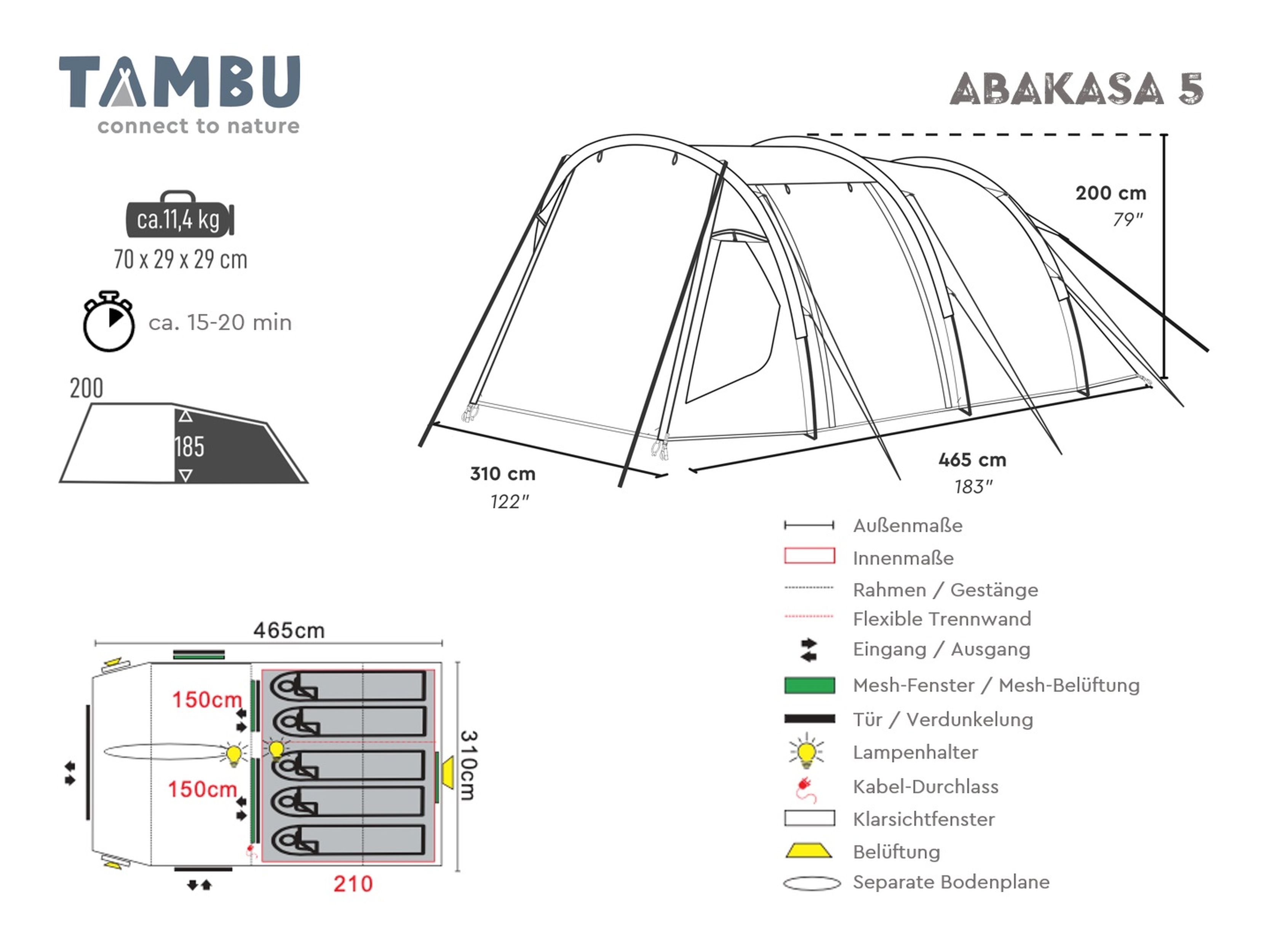 ABAKASA 5 -teltta TAMBUlta on tilava perhetunnelteltta leirintälomille, pidempiin oleskeluihin leirintäalueella tai matkustamiseen lasten kanssa. Klassinen tunnelirakenne mahdollistaa tehokkaan tilankäytön, hyvän vakauden ja miellyttävän seisomakorkeuden oleskelutilassa.