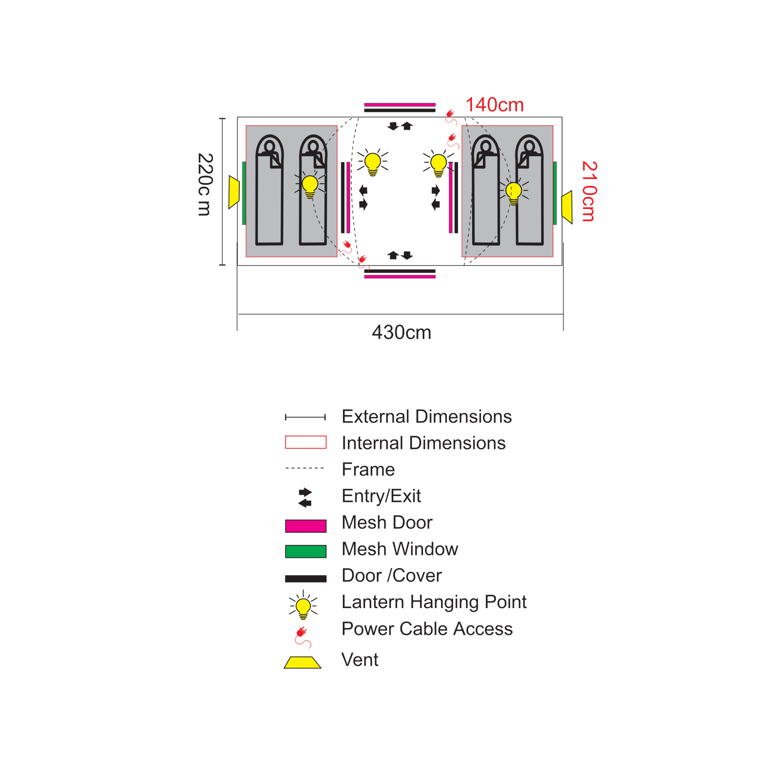 Molemmilla sivuilla sijaitsevat suuret sisäänkäynnit on varustettu sekä mesh- että kangasovilla, ja ne voidaan avata joustavasti tai pystyttää aurinko- tai sadesuojaksi. Yhdessä päätyjen lisätuuletusaukkojen kanssa ne takaavat erinomaisen ilmanvaihdon. Hienosilmäinen No-See-Um-mesh suojaa tehokkaasti hyönteisiltä – erityisen miellyttävää lämpiminä ja kosteina öinä.
