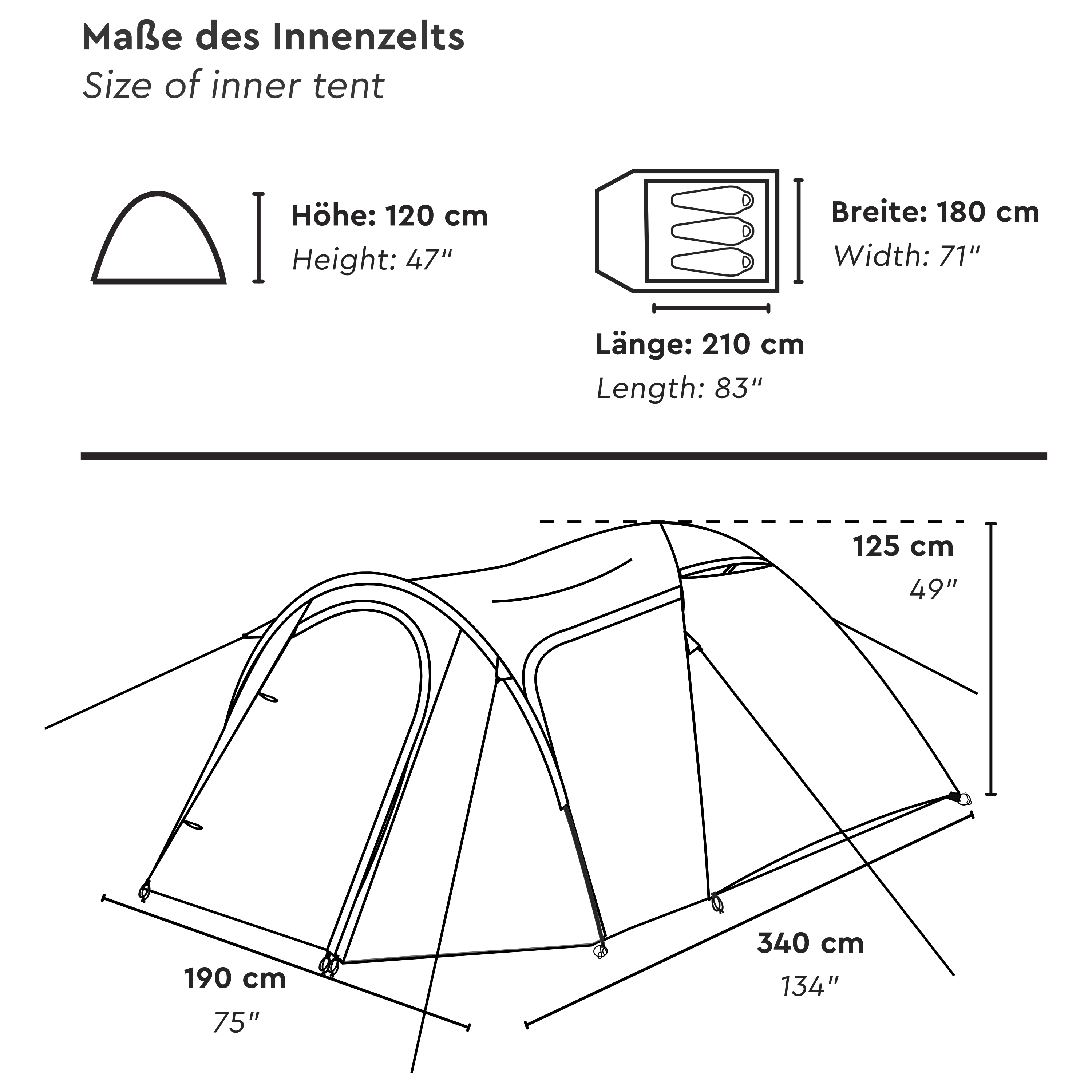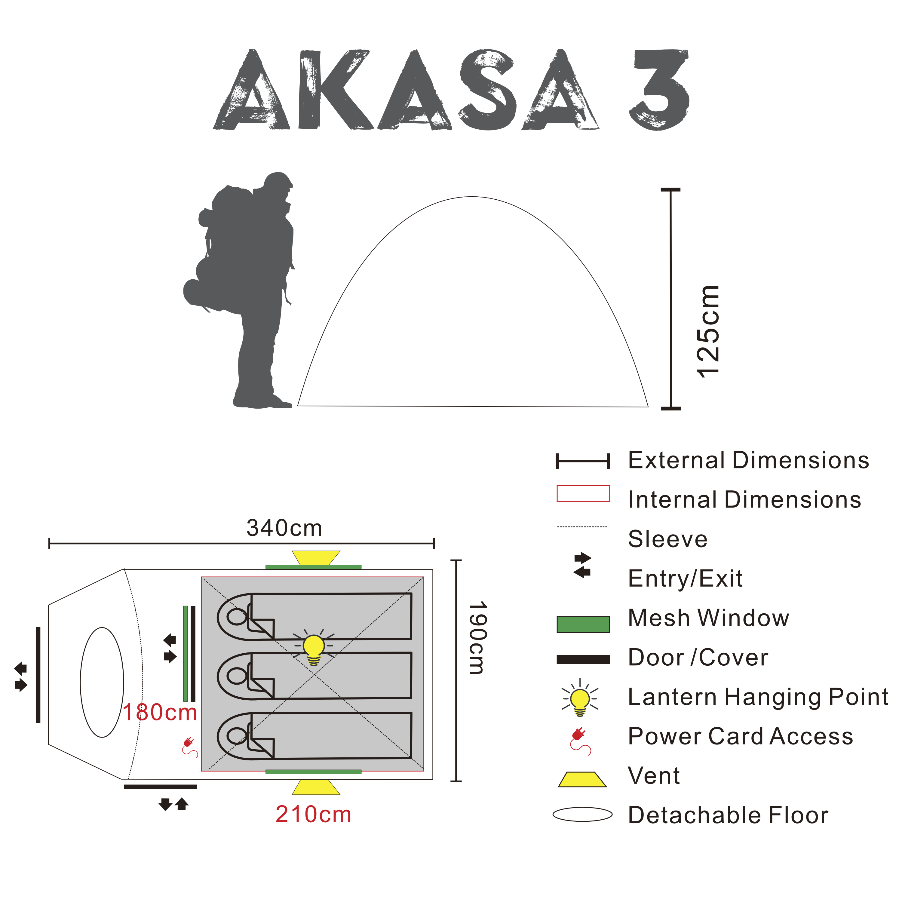 Ulkomitoiltaan noin 340 × 190 × 125 cm (P × L × K) oleva AKASA 3 tarjoaa suojaisan makuutilan sekä pidennetyn eteisosan, joka tuo lisätilaa rinkoille, kengille tai retkeilyvarusteille. Matalan rakenteensa ansiosta teltta on erityisen tuuli- ja myrskykestävä – selkeä etu vaihtelevissa sääolosuhteissa.