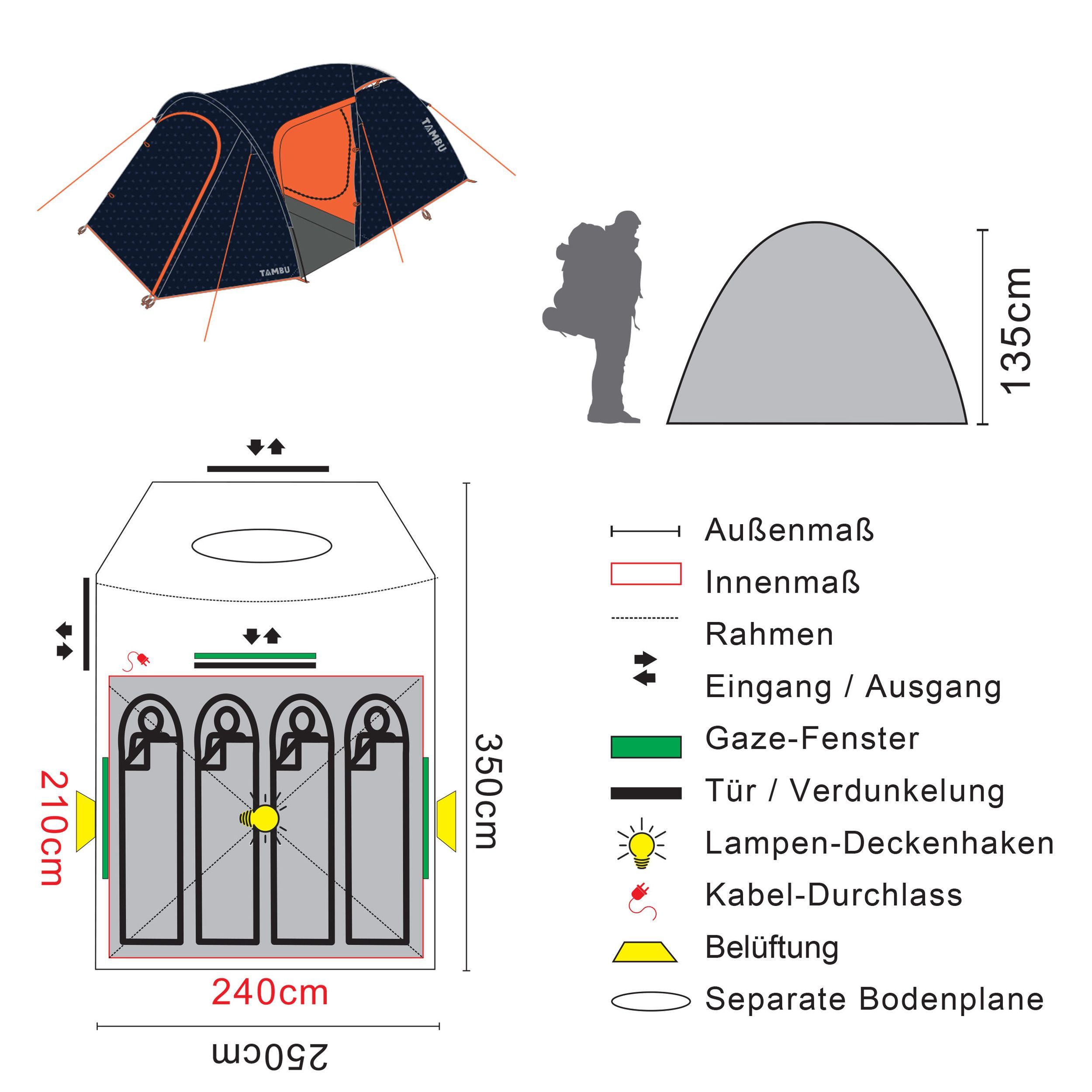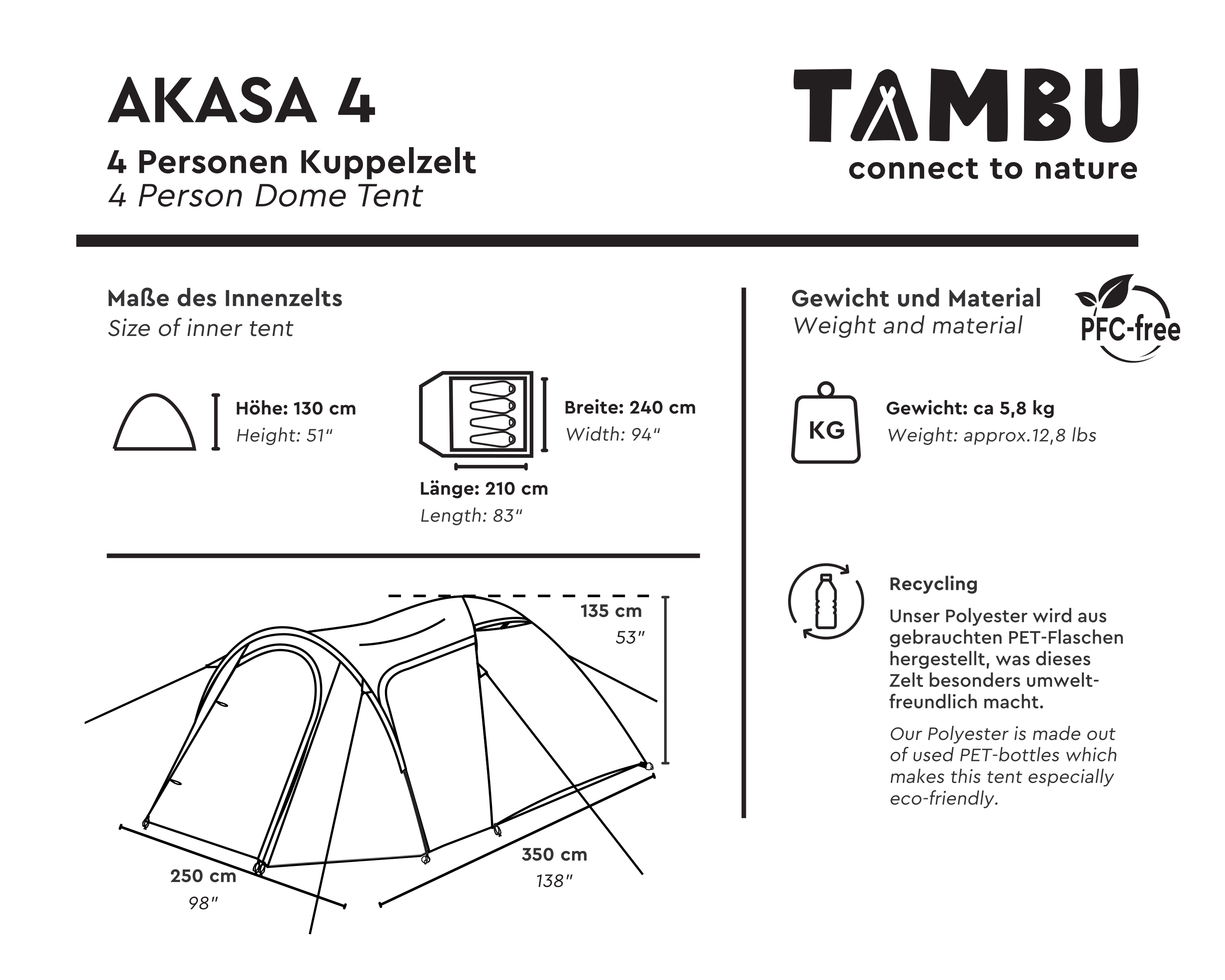 Kaksi sisäänkäyntiä – yksi edessä ja yksi sivulla – helpottavat arkea leirintäalueella ja parantavat ilmanvaihtoa. Ulkoteltta on valmistettu 100 % kierrätetystä rPET-polyesteristä, joka on tuotettu PET-pulloista, ja se heijastaa TAMBU-brändin vastuullista ajattelutapaa. Teltan tunnusomainen pintakuviointi antaa sille modernin ilmeen, ja kestävät materiaalit sekä vahvat kiinnityspisteet takaavat luotettavan käytön.