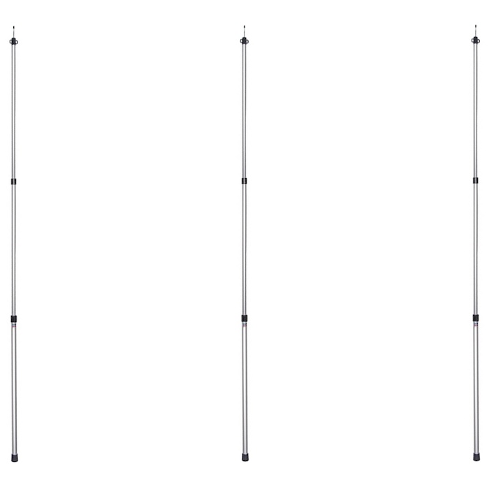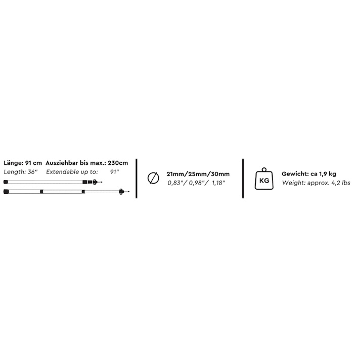 Jokainen tanko on teleskooppisesti säädettävä, ja pituus voidaan säätää portaattomasti noin 91 cm:stä aina 230 cm:iin. Kolme porrastettua halkaisijaa (21 mm, 25 mm ja 30 mm) takaavat hyvän vakauden myös suuremmilla jänneväleillä. Kestävä alumiini yhdistää keveyden ja hyvän kuormituskestävyyden, mikä tekee tangoista ihanteelliset liikkuvaan käyttöön campingissa, vanlife-matkailussa tai vaelluksilla.