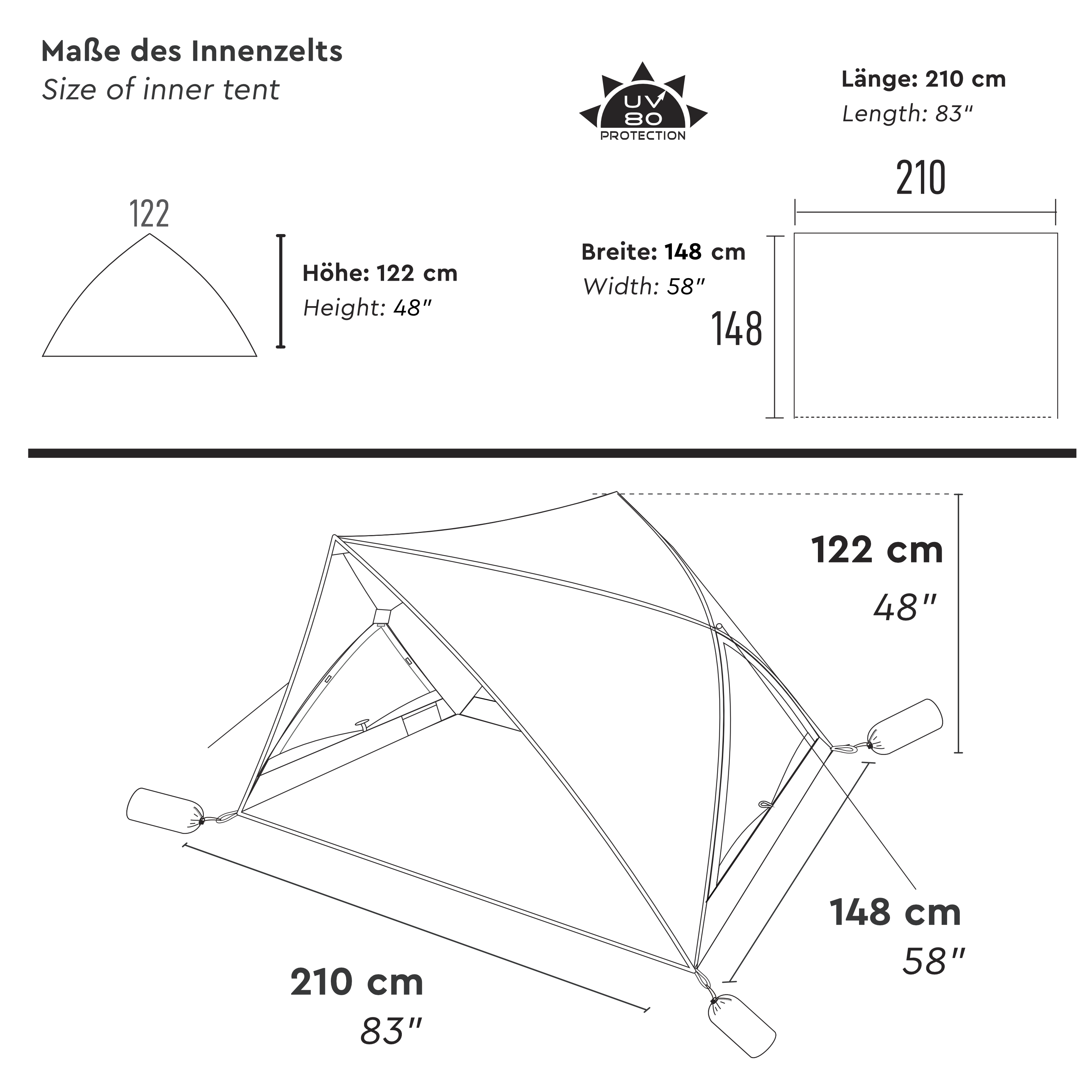 Kolme suurta No-See-Um-mesh-tuuletusaluetta (50 × 50 cm) takaavat hyvän ilmanvaihdon ja pitävät hyönteiset loitolla. Ulkomitat noin 210 × 148 × 122 cm tarjoavat riittävästi tilaa istumiseen, makoiluun tai lasten leikkeihin.