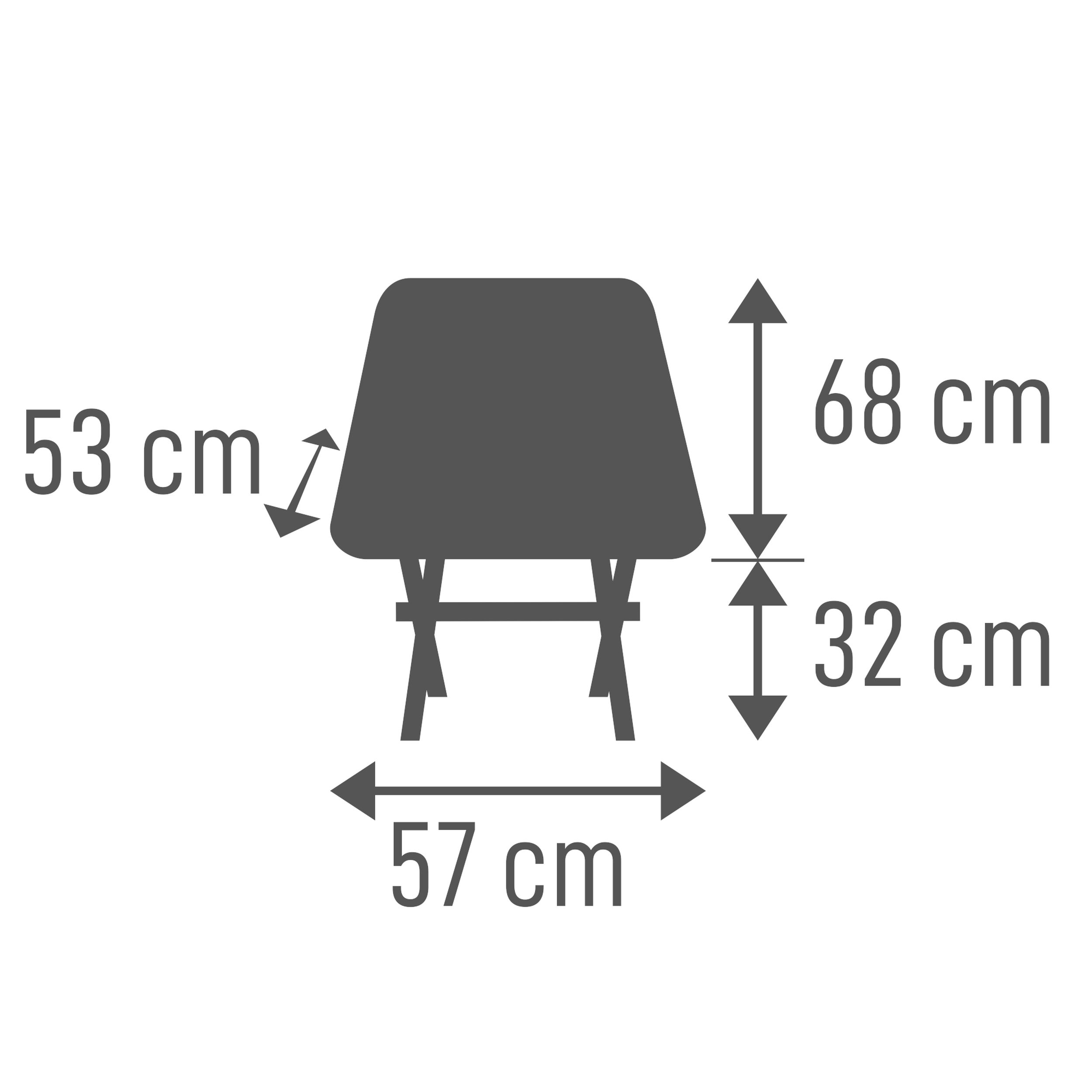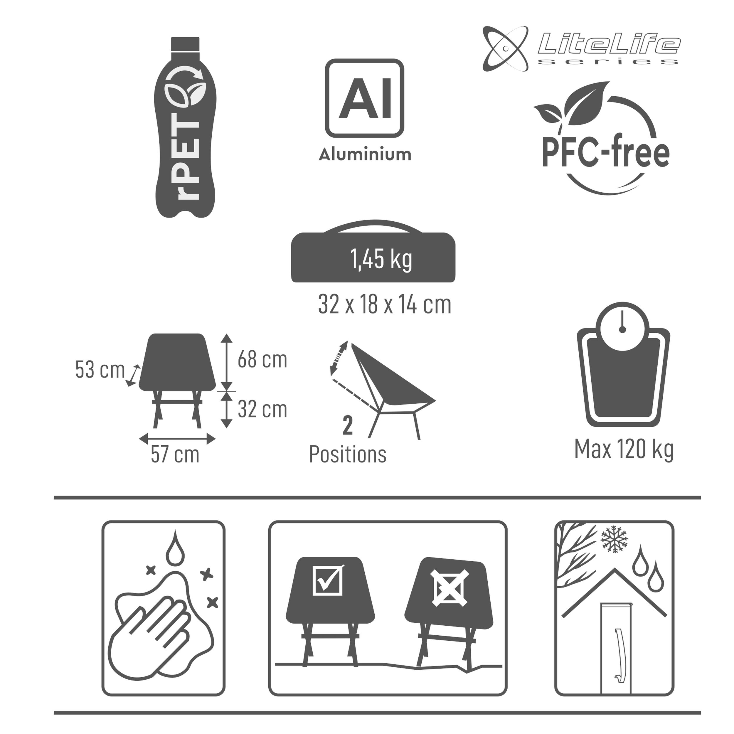 Tukeva alumiinirunko mahdollistaa jopa 120 kg:n enimmäiskuormituksen ja takaa vakaan rakenteen kevyestä kokonaispainosta huolimatta. Istuinkangas on valmistettu kierrätetystä PET-pulloista tehdystä polyesteristä yhdistettynä hengittävään nylon-meshiin, mikä lisää istuinmukavuutta erityisesti lämpiminä päivinä. Neljä suurta, liukumista estävää jalkaa varmistavat tukevan pidon lähes kaikilla alustoilla.