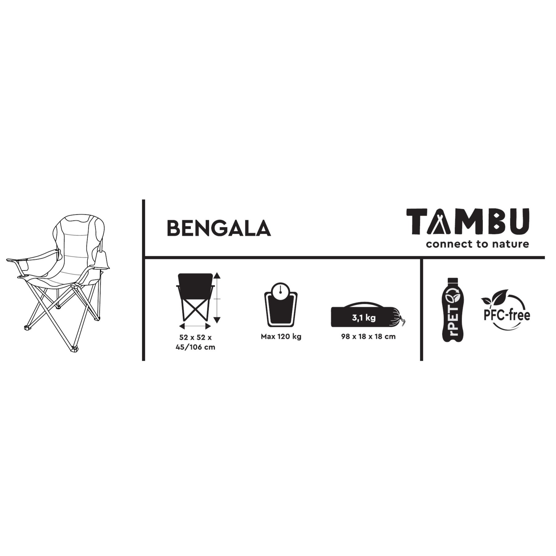 BENGALA-retkituoli TAMBUlta on monipuolinen ja kestävä kumppani leirintään, kalastukseen, festivaaleille tai rentoihin grilli-iltoihin puutarhassa. Mukava 45 cm istuinkorkeus ja 106 cm selkänojan korkeus tarjoavat miellyttävän, ryhdikkään istuma-asennon – ihanteellinen pitkille illoille ulkona.