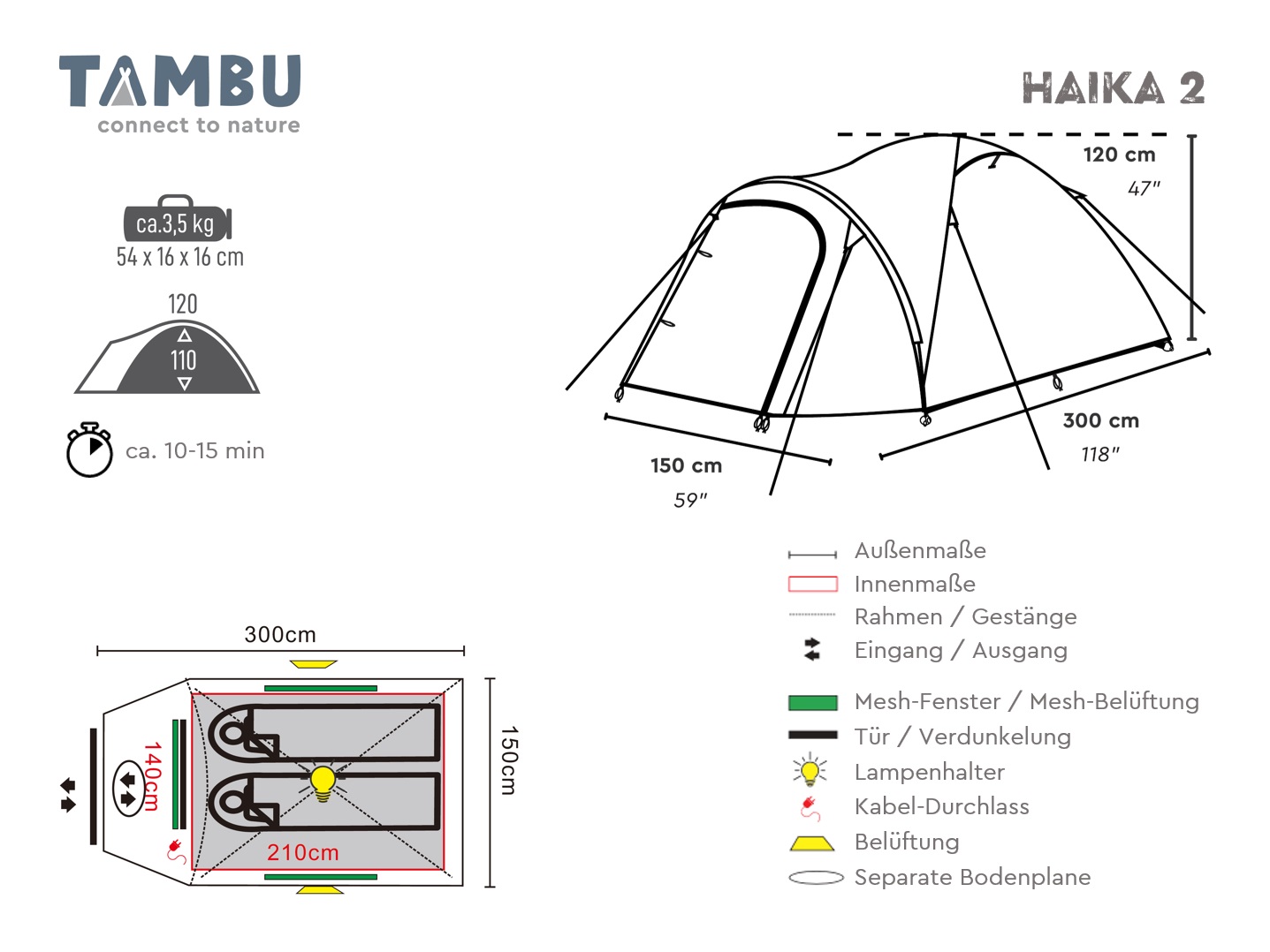 HAIKA 2 -teltta TAMBUlta on kompakti ja helppokäyttöinen kahden hengen kupoliteltta, joka on nopea pystyttää ja purkaa yksinkertaisen rakenteensa ansiosta. Kevyen painonsa ja tilaa säästävän pakkauskokonsa vuoksi se sopii erinomaisesti leirintälomille, viikonloppureissuille, vaelluksille tai festivaaleille.