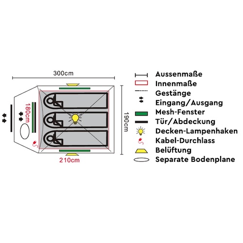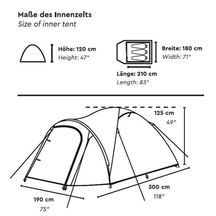 Ulkoteltta on kooltaan noin 300 × 190 × 125 cm (P × L × K) ja tarjoaa suojaisan sisäänkäynti- ja eteisalueen etuosassa. Toimitukseen sisältyvä erillinen pohjapeite etuosaan laajentaa käytettävää tilaa merkittävästi. Näin kengät, reput ja varusteet voidaan säilyttää siististi ja kuivina, samalla kun makuutila pysyy vapaana ja järjestyksessä.
