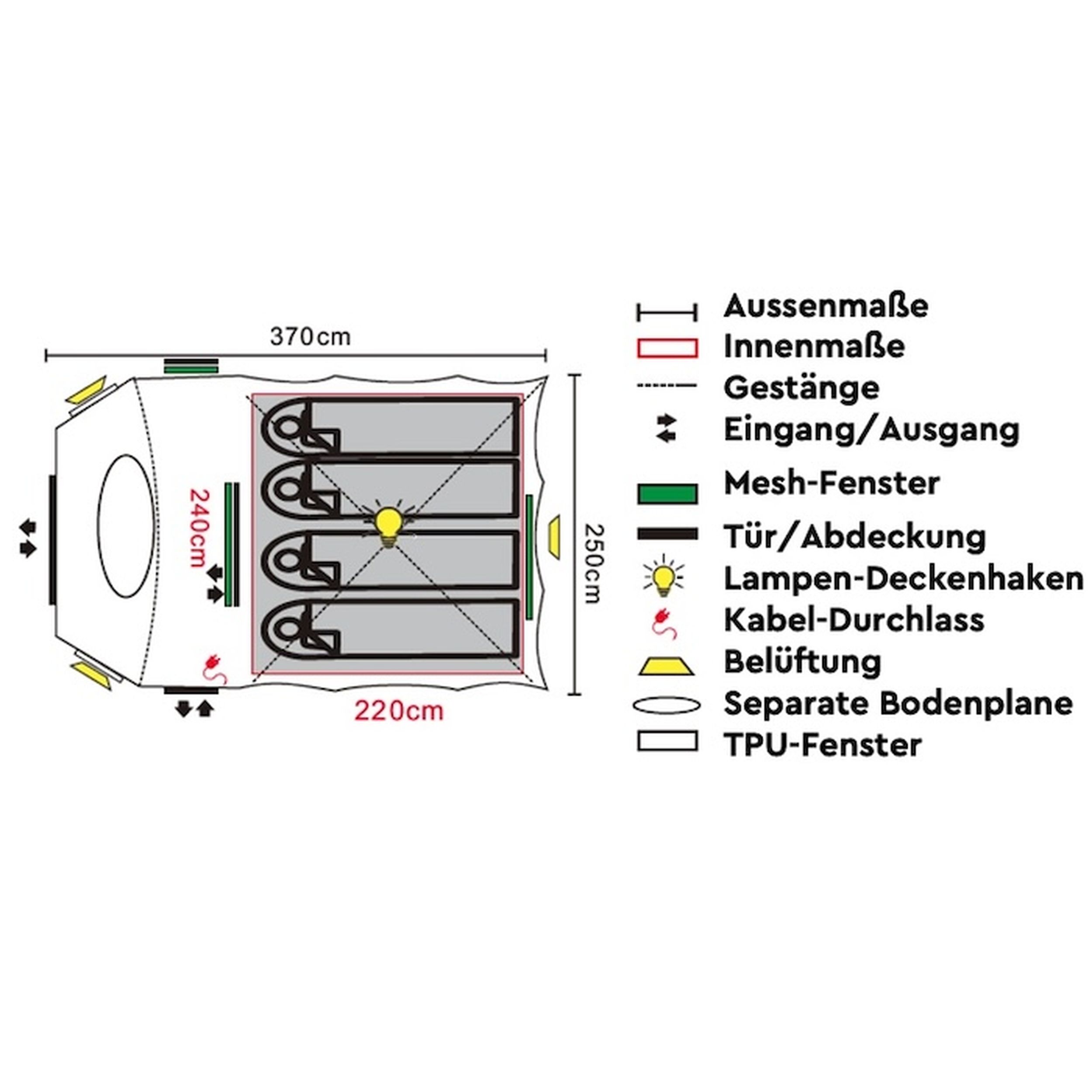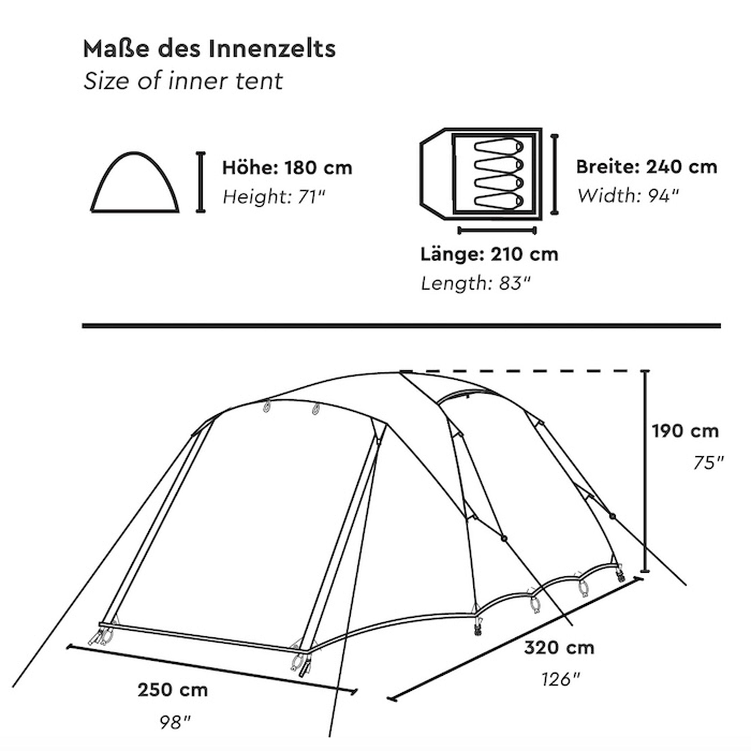 Ulkoteltan kokonaismitat ovat noin 320 × 250 × 190 cm (P × L × K), tarjoten runsaasti sisätilaa. Maksimikorkeus noin 180 cm mahdollistaa seisomisen teltan sisällä ja luo miellyttävän tilantunteen. Suuri, noin 160 cm korkea etusisäänkäynti helpottaa kulkua ja parantaa ilmanvaihtoa.