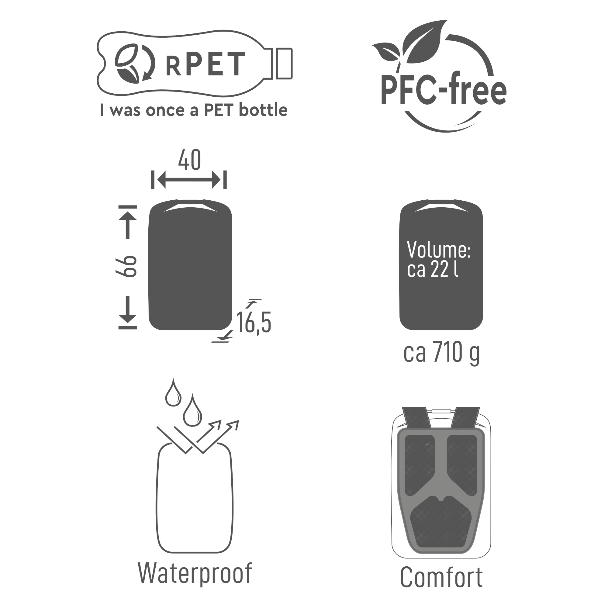 Rolltop-sulku yhdistettynä laadukkaaseen, vettähylkivään vetoketjuun suojaa varusteesi luotettavasti sateelta ja kosteudelta. Kestävä ulkomateriaali on valmistettu kierrätetystä 600D polyesteristä TPU-pinnoitteella. Se on PFC-vapaa, pitkäikäinen ja suunniteltu päivittäiseen käyttöön vaihtelevissa sääolosuhteissa. Sisäpuolella TPU-pinnoitettu 210D-polyesterivuori tarjoaa lisäsuojaa kosteutta vastaan.