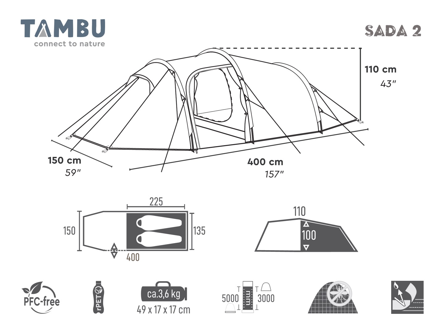 Noin 3,6 kg painollaan ja kompaktilla, noin 49 × 17 × 17 cm pakkauskoollaan SADA 2 on helposti kuljetettavissa tunnelirakenteestaan huolimatta. Tukeva alumiinirunko takaa vakaan pystytyksen ja luotettavan suojan vaihtelevissa sääolosuhteissa.