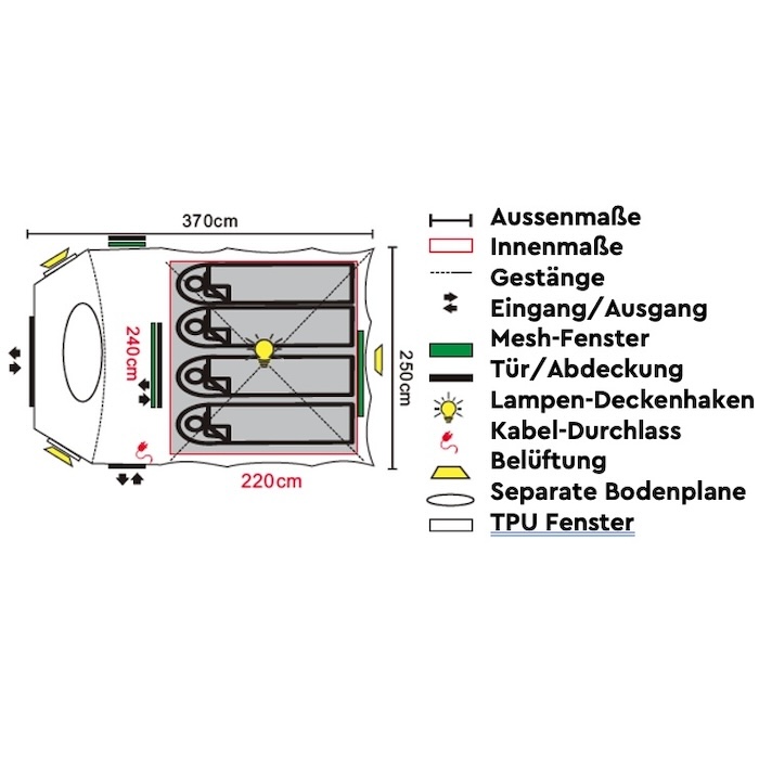 Ulkoteltan kokonaismitat ovat noin 370 × 250 × 190 cm (P × L × K), tarjoten riittävästi tilaa toimivalle oleskelu- ja asumisalueelle. Enimmäissisäkorkeus noin 180 cm mahdollistaa pystyasennossa seisomisen ja luo miellyttävän tilantunteen. Suuri etuovi helpottaa kulkua, ja sitä täydentää sivusisäänkäynti, joka lisää teltan joustavuutta eri käyttötilanteissa.