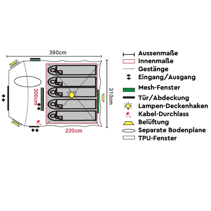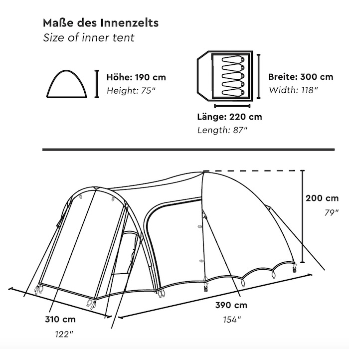 Makuukabiinin mitat ovat noin 220 × 300 × 190 cm (P × L × K), ja se tarjoaa tilaa jopa viidelle hengelle. Kupolirakenne ja korkea sisätila mahdollistavat erinomaisen liikkumisvapauden – ihanteellinen pukeutumiseen, lasten kanssa matkustamiseen tai pidempiin oleskeluihin huonommalla säällä. Sisäteltassa on myös käytännöllinen kaapeliläpivienti, jonka kautta esimerkiksi varavirtalähde, valaisin tai muu laite voidaan tuoda siististi teltan sisälle.