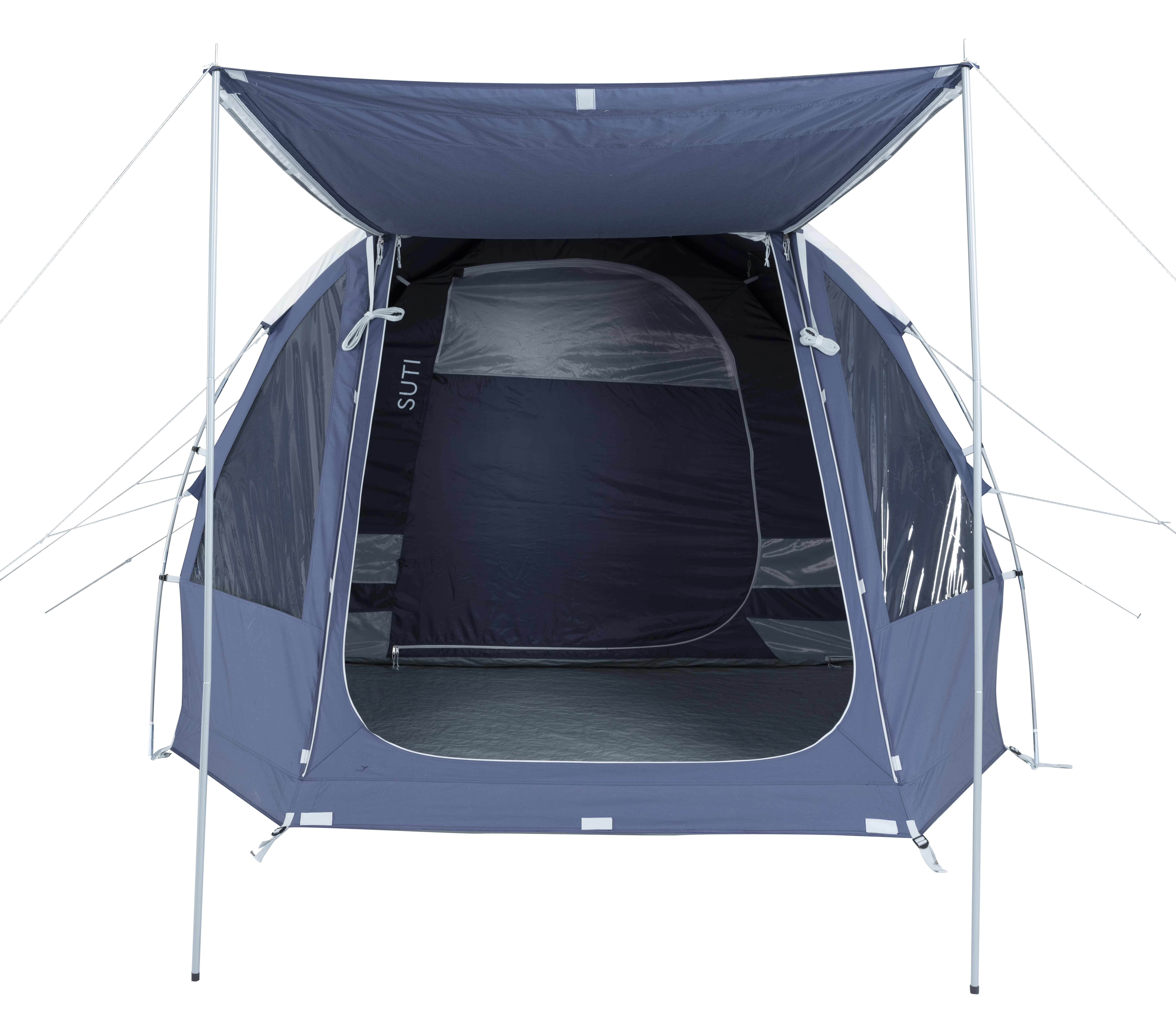 Eteistila toimii suojaisana oleskelualueena istumiseen, pukeutumiseen tai varusteiden säilytykseen. Suuret ovet erillisellä hyttysverkko-ovella takaavat hyvän ilmanvaihdon ja luotettavan suojan hyönteisiltä. Useat PVC-vapaasta TPU-materiaalista valmistetut ikkunat päästävät runsaasti luonnonvaloa sisään ilman häikäisyä, ja ne voidaan tarvittaessa peittää sisäpuolelta. TPU on pehmeä ja joustava materiaali, joka ei kellastu eikä sisällä pehmittimiä.