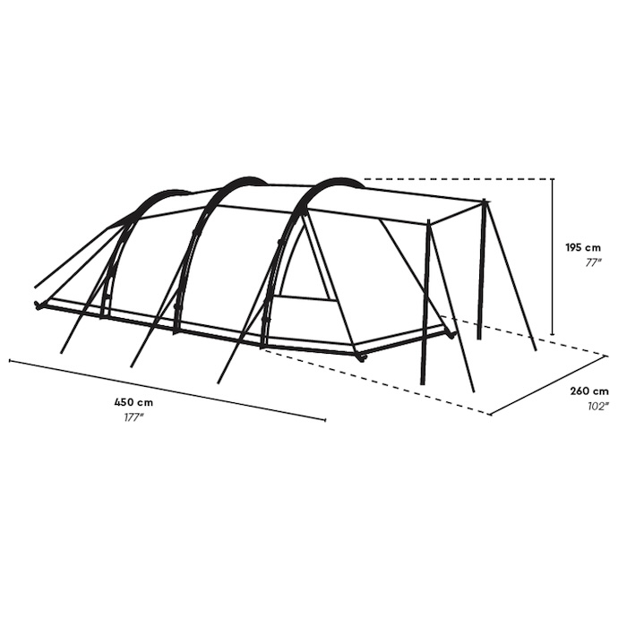 Ulkoteltan mitat ovat noin 450 × 260 × 195 cm (P × L × K), joten tilaa riittää rentoihin leiripäiviin. Sisätila jakautuu selkeästi oleskelualueeseen ja makuukabiniin. Makuukabinin mitat ovat noin 240 × 210 × 185 cm, ja se tarjoaa mukavasti tilaa jopa neljälle hengelle. Keskellä oleva irrotettava väliseinä mahdollistaa makuutilan joustavan jakamisen – ihanteellinen perheille tai silloin, kun halutaan lisää yksityisyyttä.